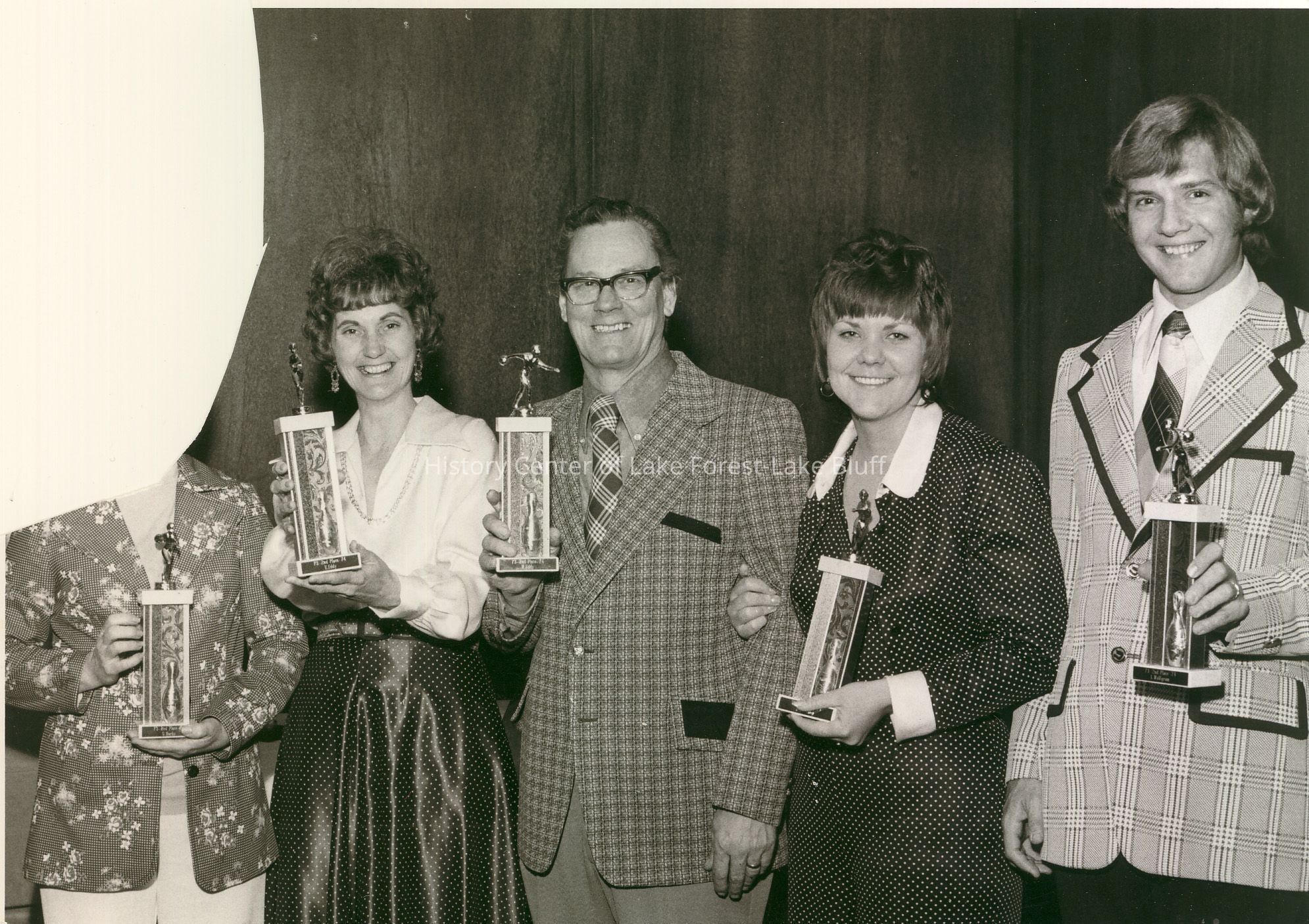 Five people are holding trophies, smiling, and dressed in vintage attire, standing together indoors against a plain