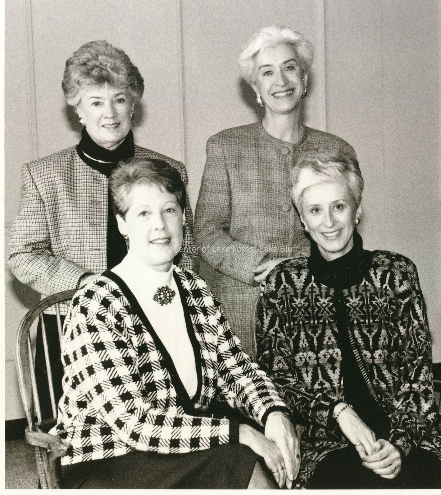 Four women, wearing patterned jackets, pose together and smile, showcasing a professional and friendly atmosphere.