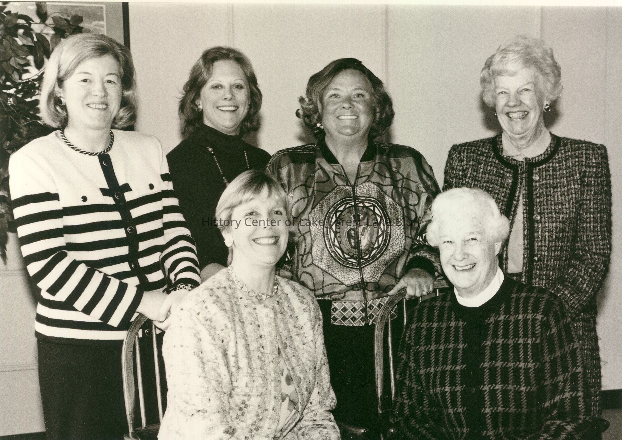 Six women are smiling together in a black-and-white group photograph indoors.