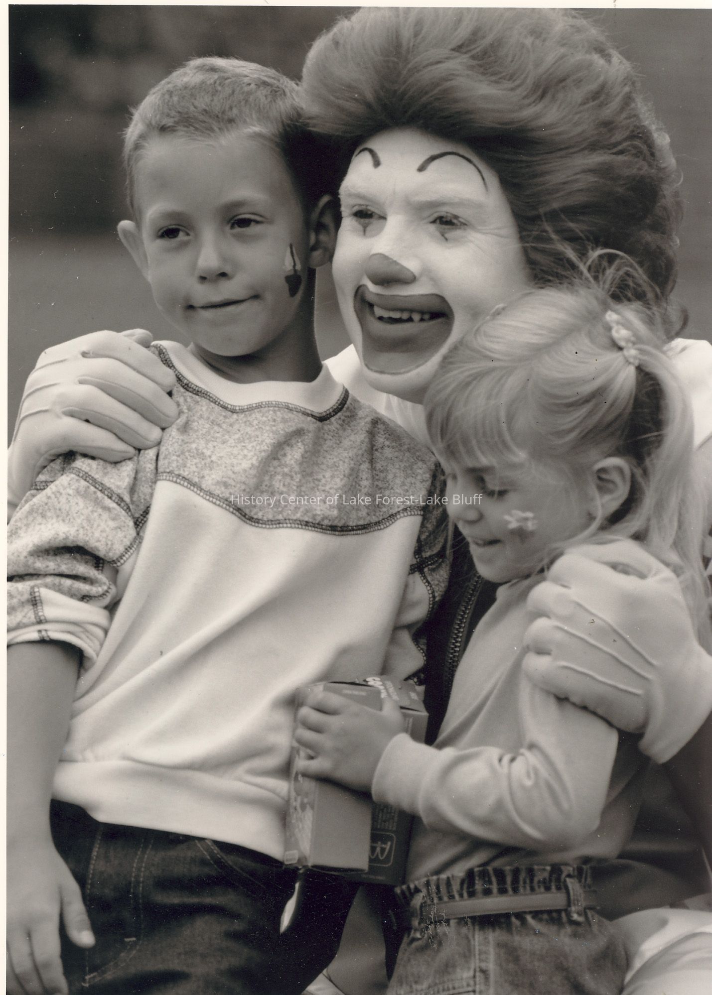 A clown (Ronald McDonald) happily poses with two joyful children, hugging them closely and smiling warmly.