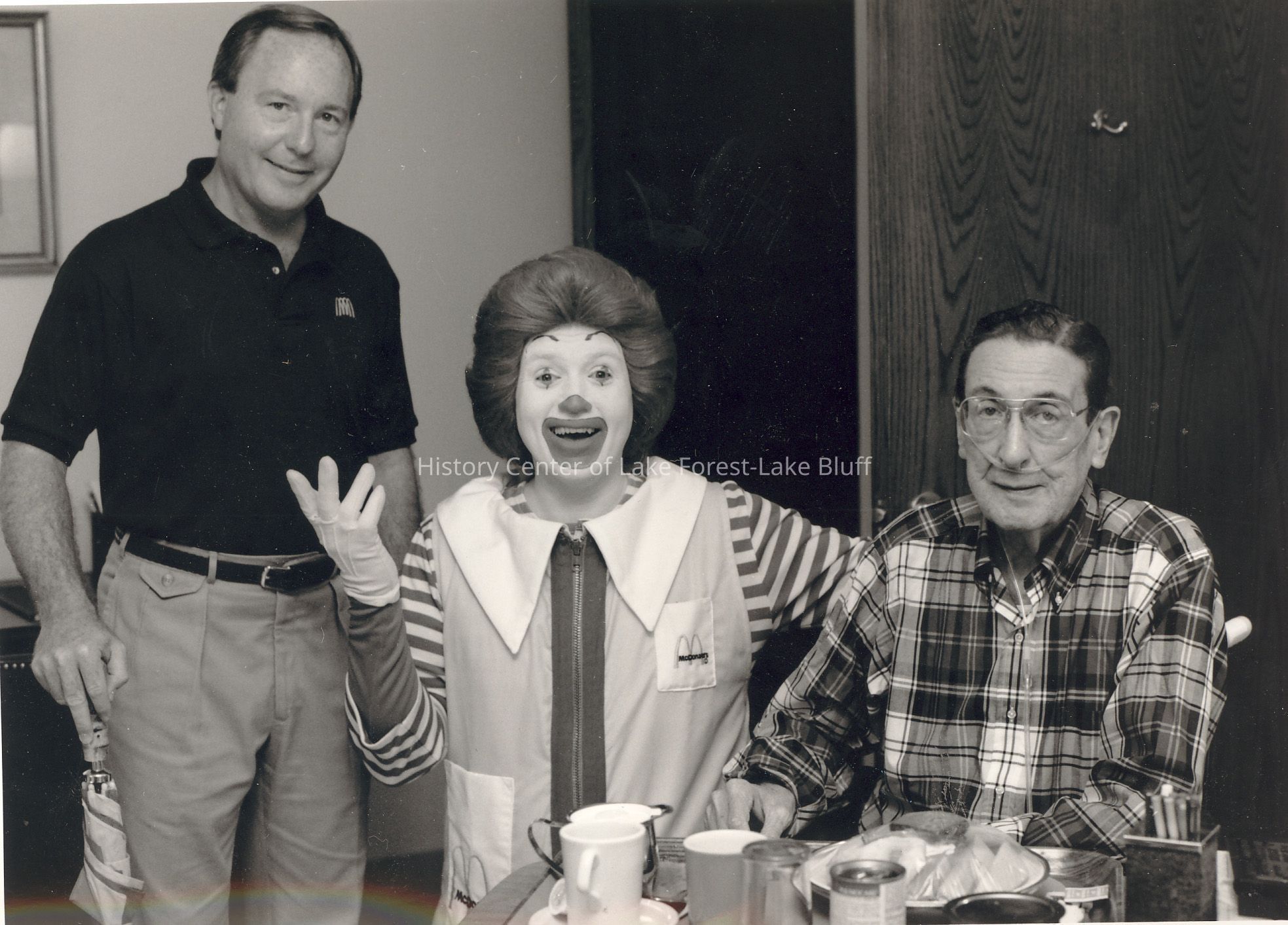 Three people are in a room, including a clown (Ronald McDonald), smiling beside a table with various items.
