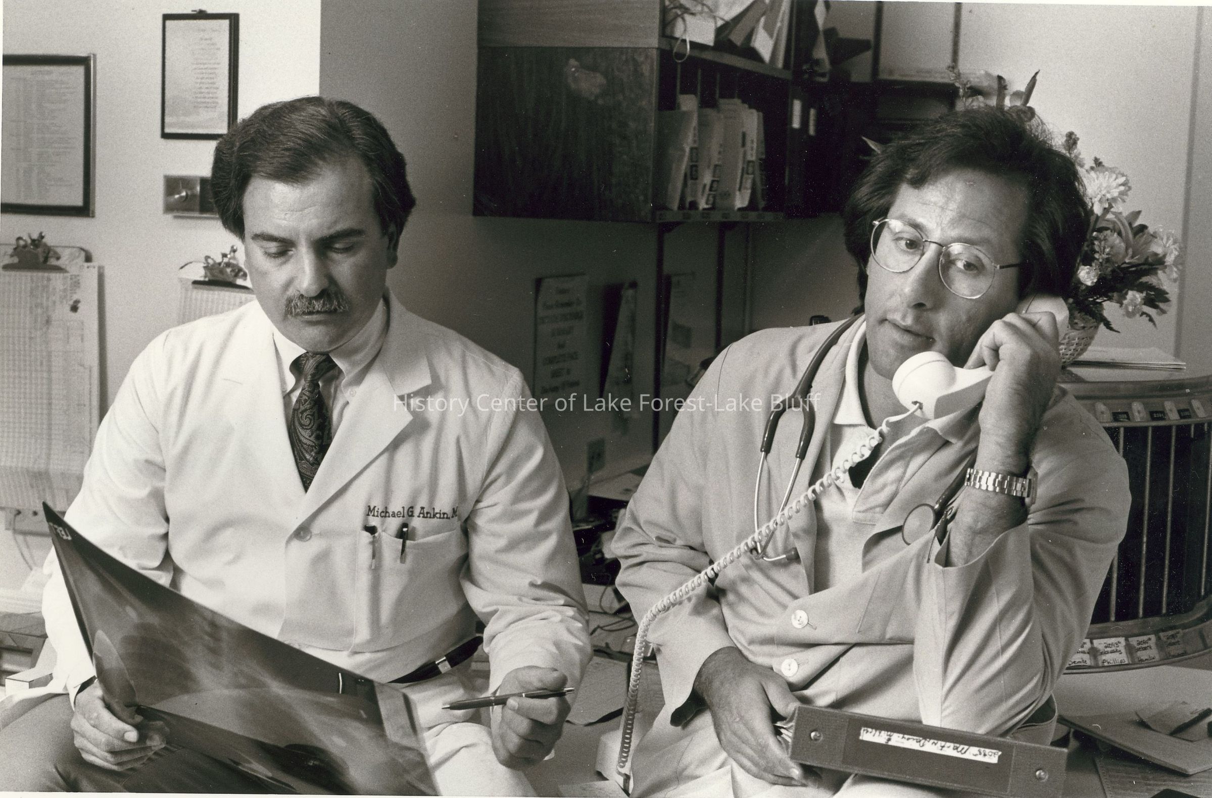 Two doctors in lab coats discuss X-ray results while one speaks on the phone.