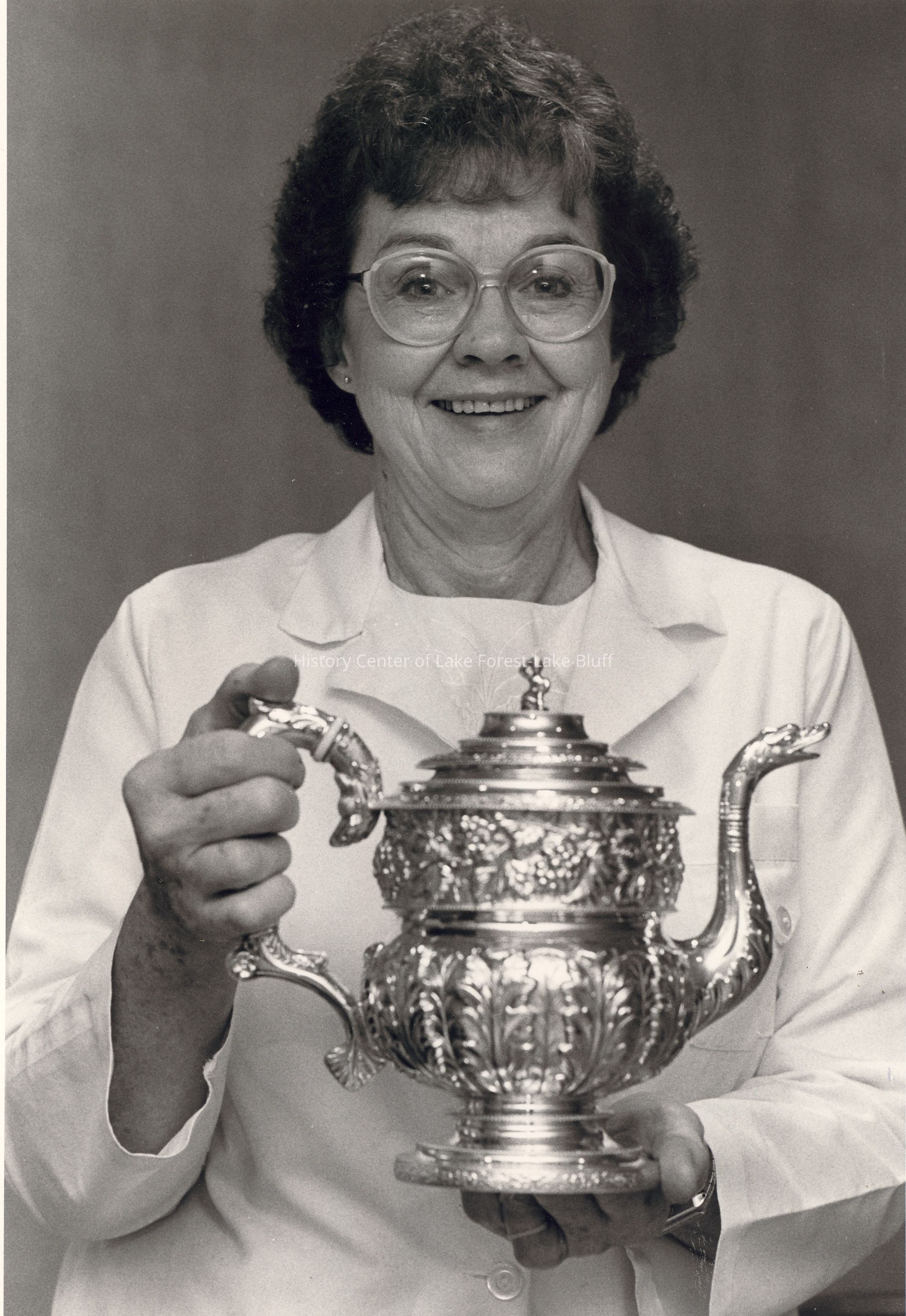 A woman with glasses holds an ornate silver teapot, smiling warmly for the camera.