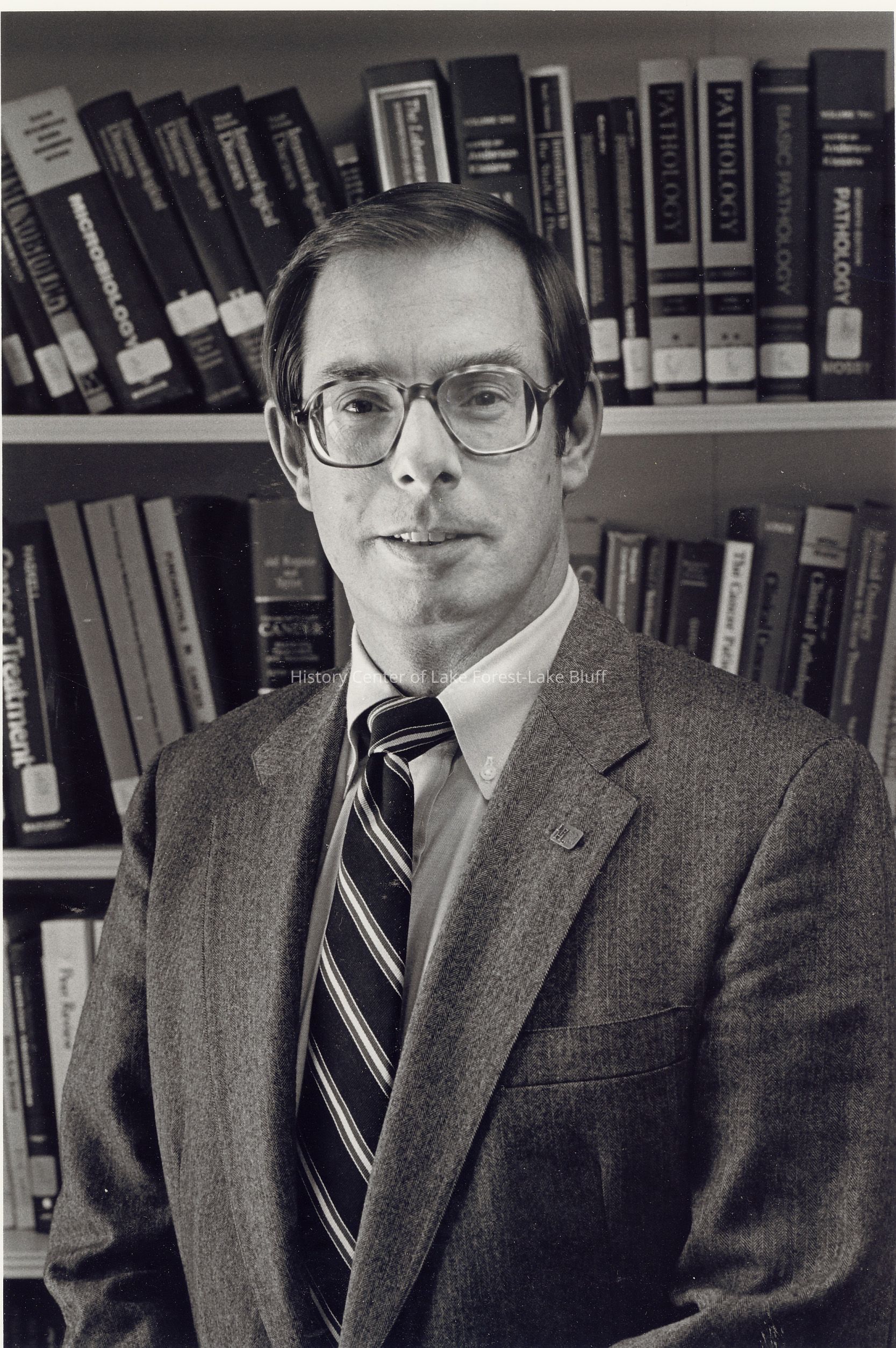 A man in a suit and tie stands in front of a bookshelf filled with various medical books.