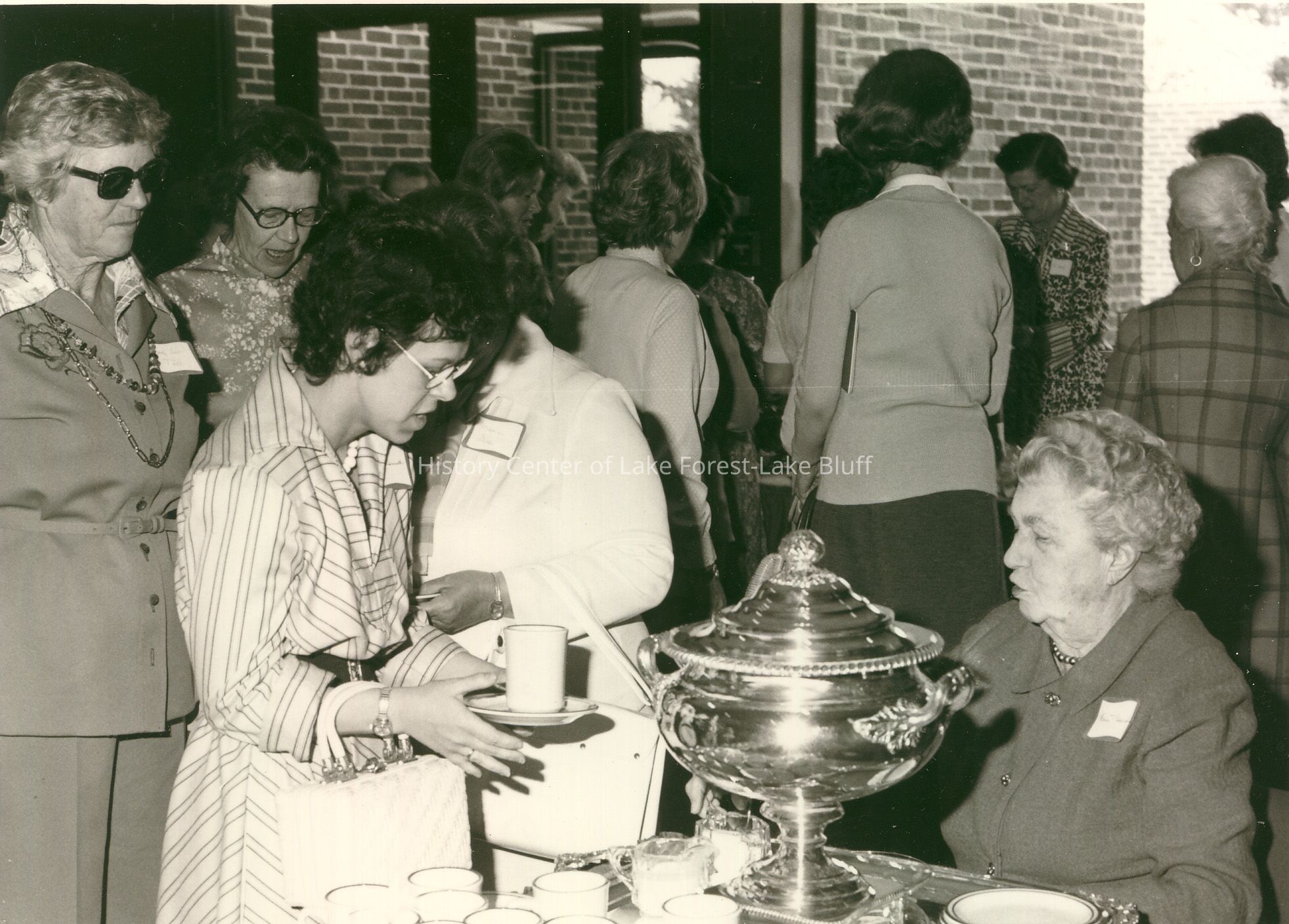 A group of women gather around a table with a large serving urn for refreshments and cups.