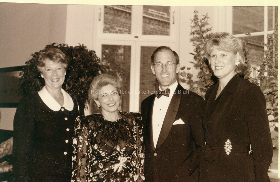 Four elegantly dressed individuals stand together, smiling inside a well-decorated room with large window.