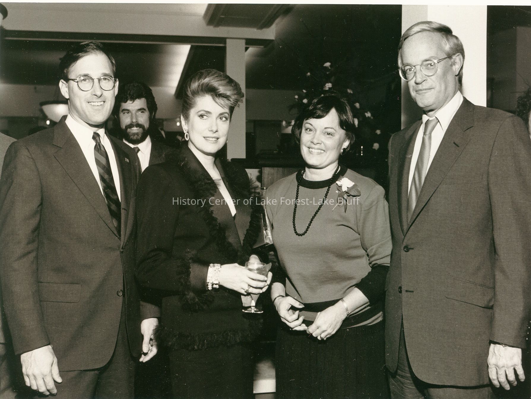 Five people are dressed formally, posing together at an indoor gathering or event, smiling warmly at the camera