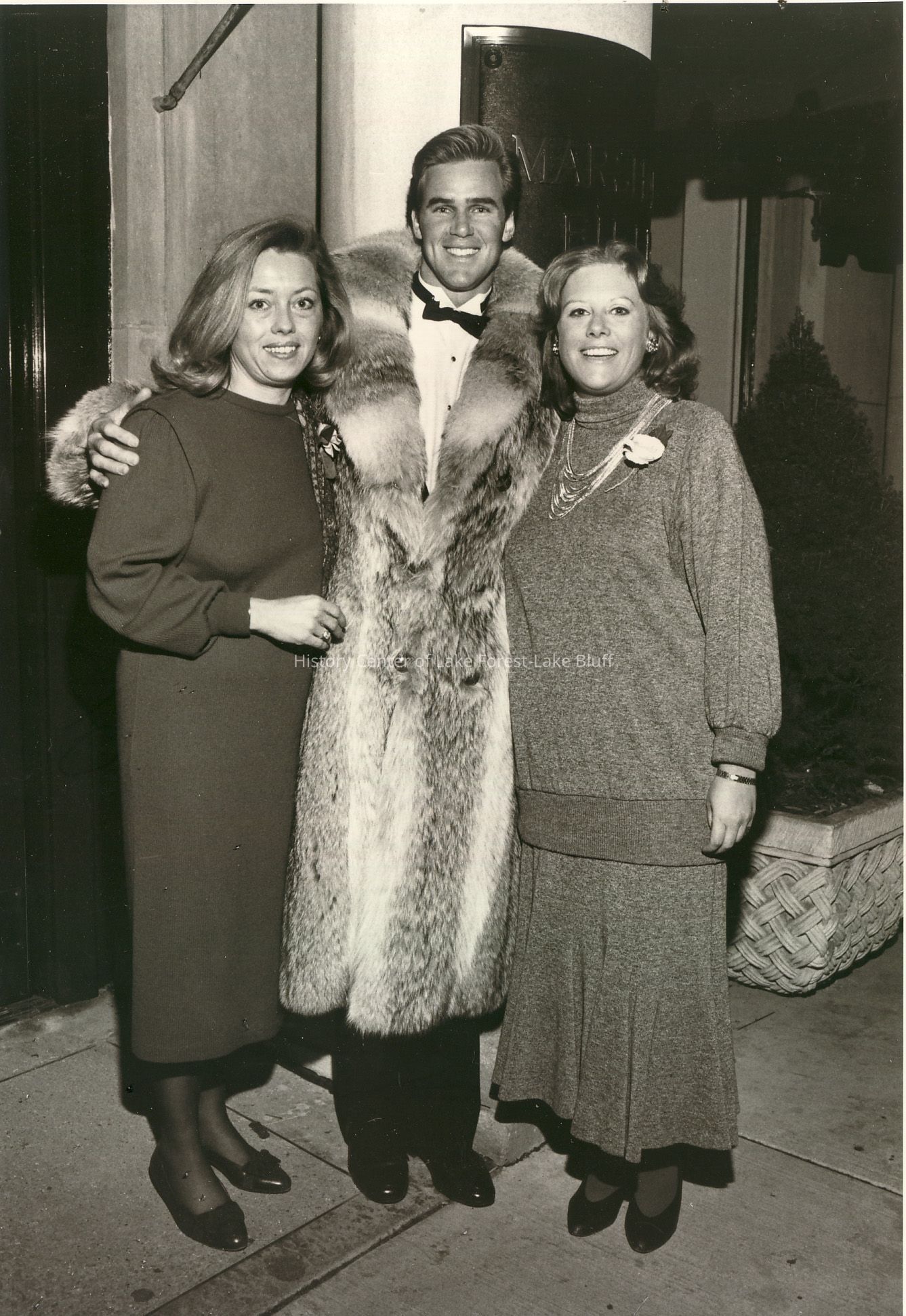 A man in a fur coat and two women pose happily outside a building, smiling broadly.