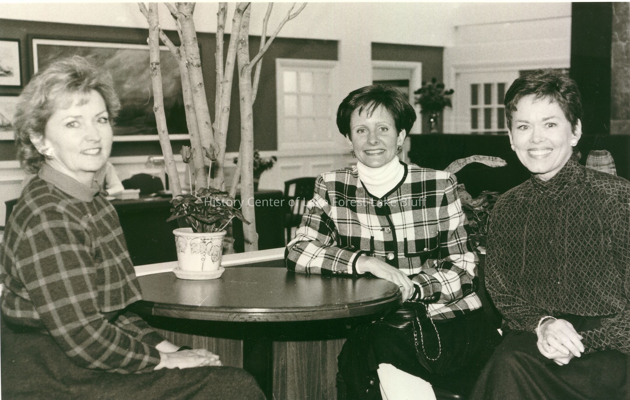 Three women, wearing patterned outfits, sit around a small table, smiling indoors near potted plants.