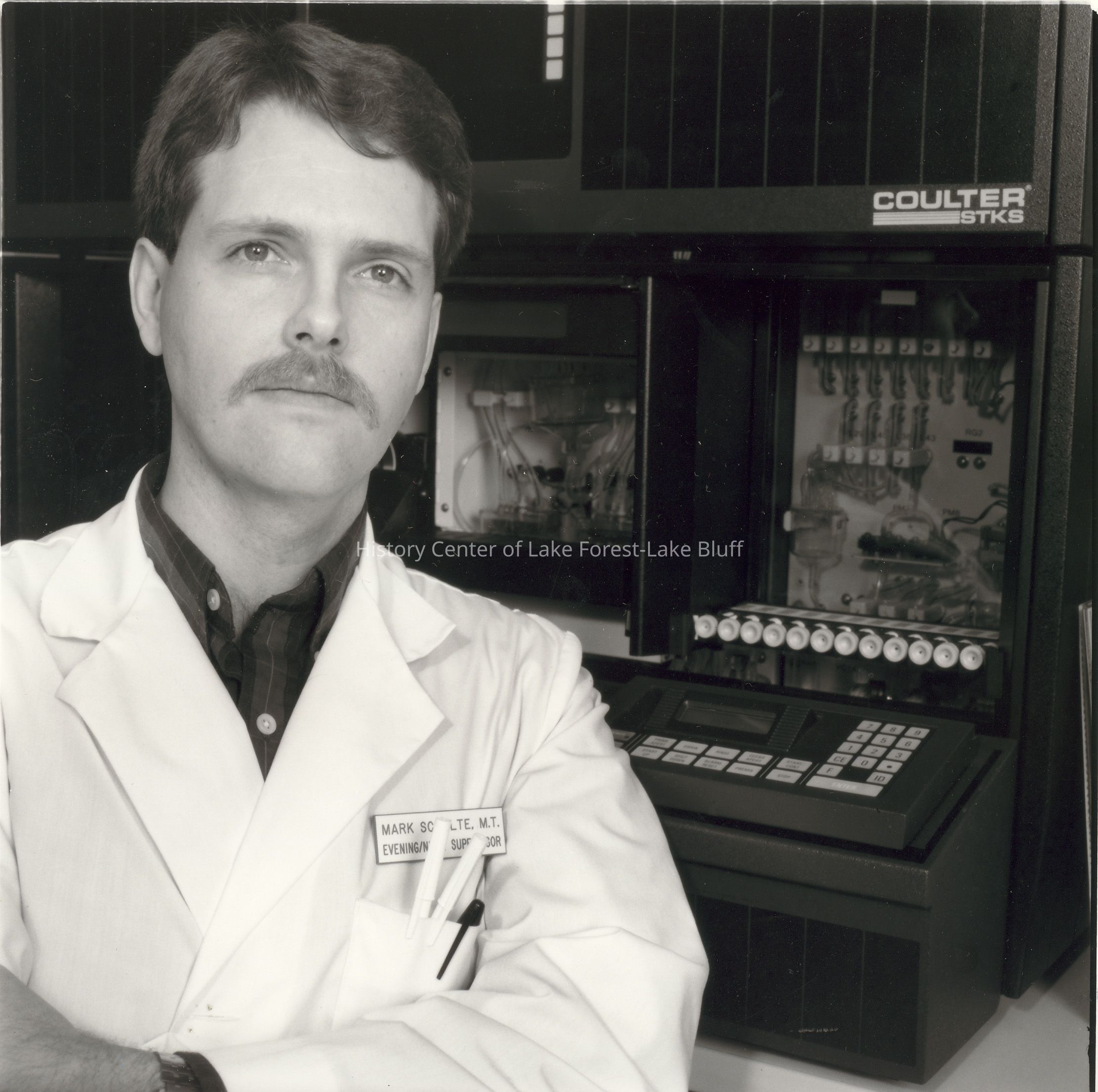 A man with a mustache wearing a lab coat stands confidently beside laboratory equipment marked "Coulter