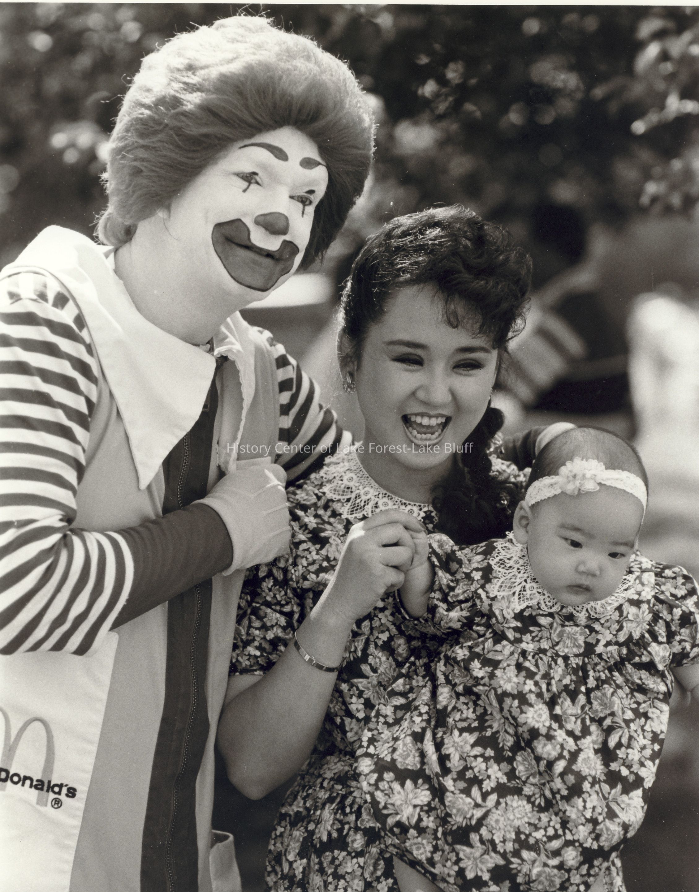 A clown (Ronald McDonald) stands with a smiling woman holding a baby in a floral dress.