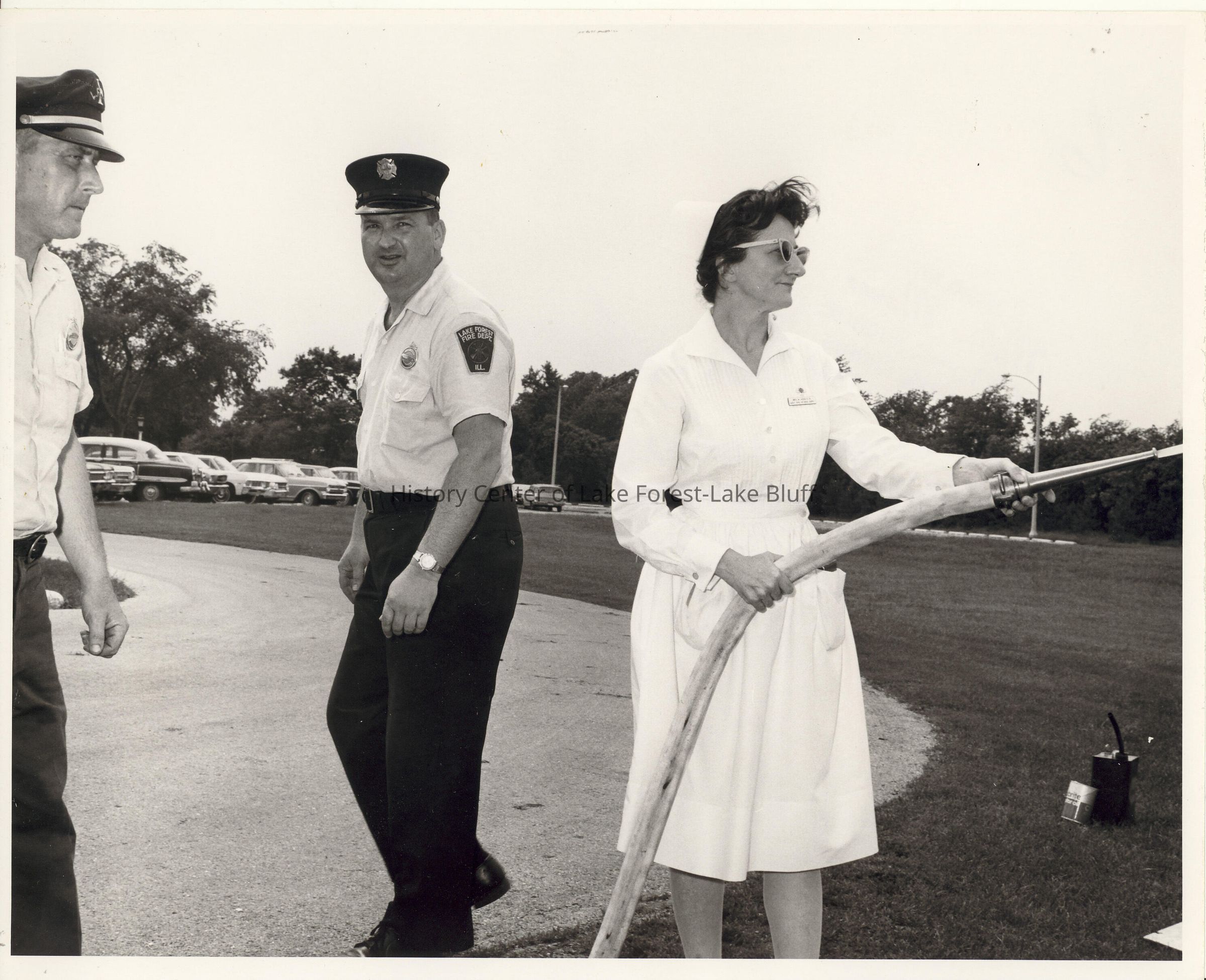 Fire Safety Training. FF Wayne Cole, ? and Nurse Horn operating fire hose observed by two firemen. Photo lists Mickey Horn (sp?)