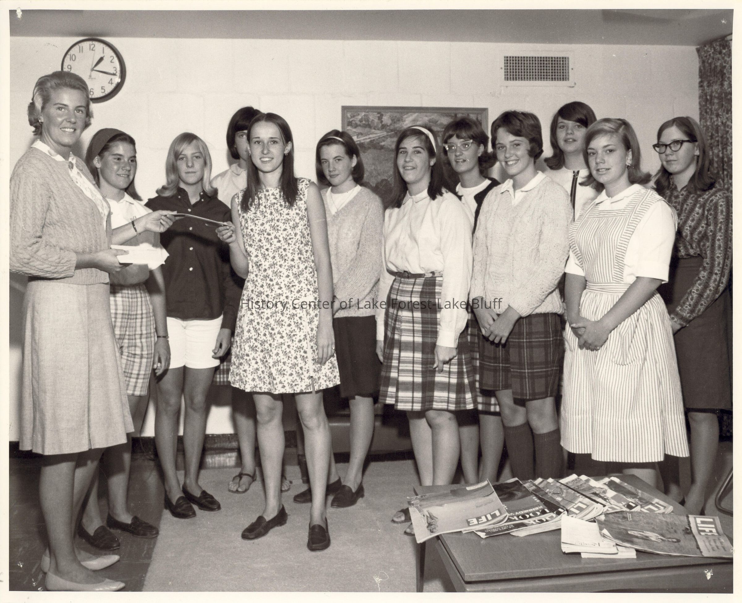 Sue Dick (Mrs. AB Dick III) handing a document to a Candy Striper observed by other Candy Stripers.