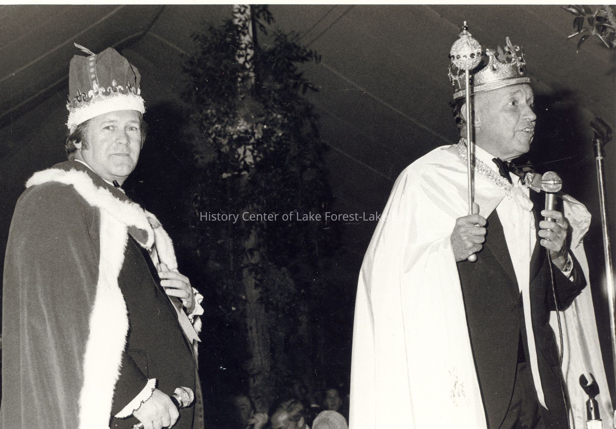 Two men in royal costumes stand on stage; one speaks into microphone, holding a scepter, wearing