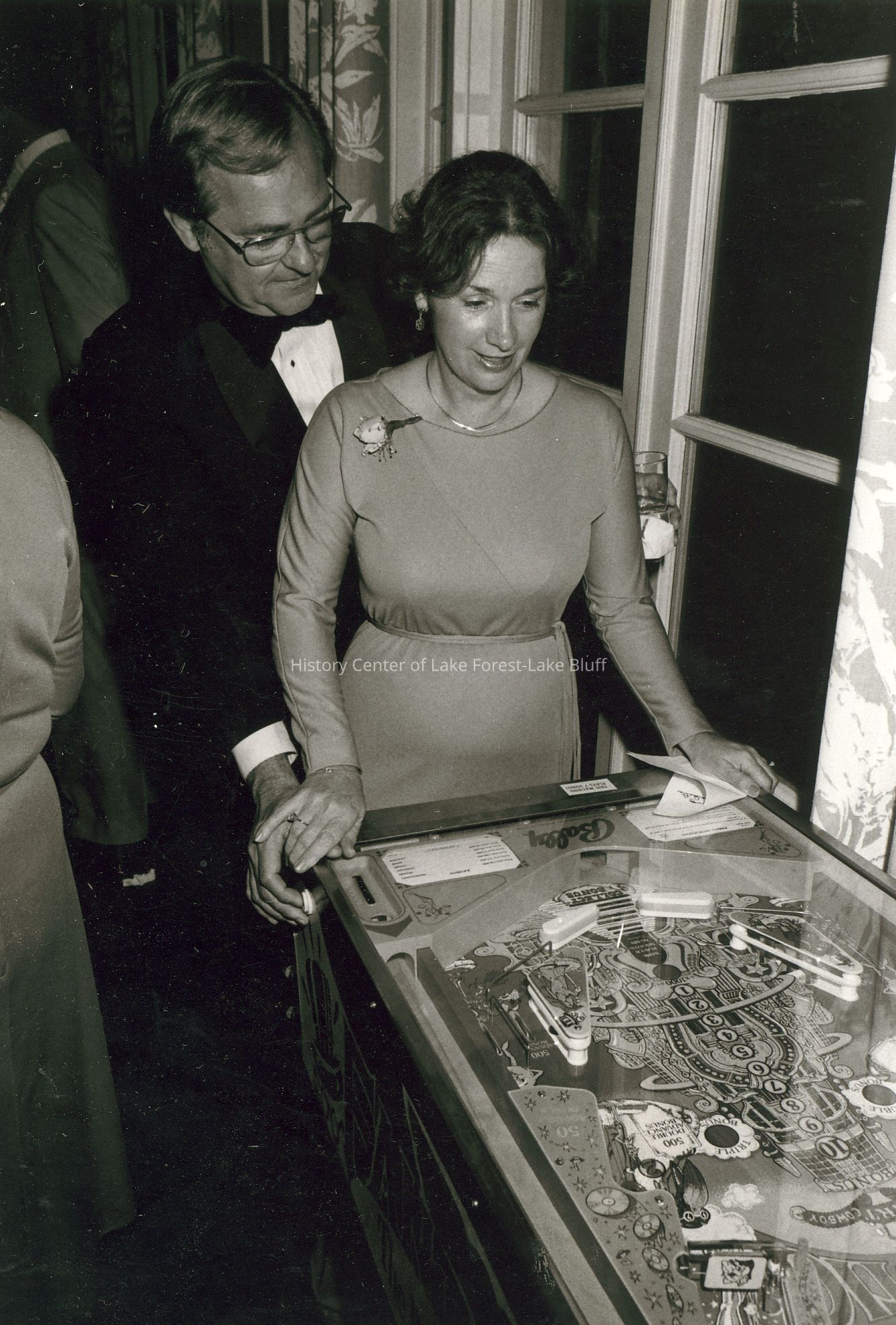 A couple stands together, smiling as they play a vintage pinball machine in a cozy room.