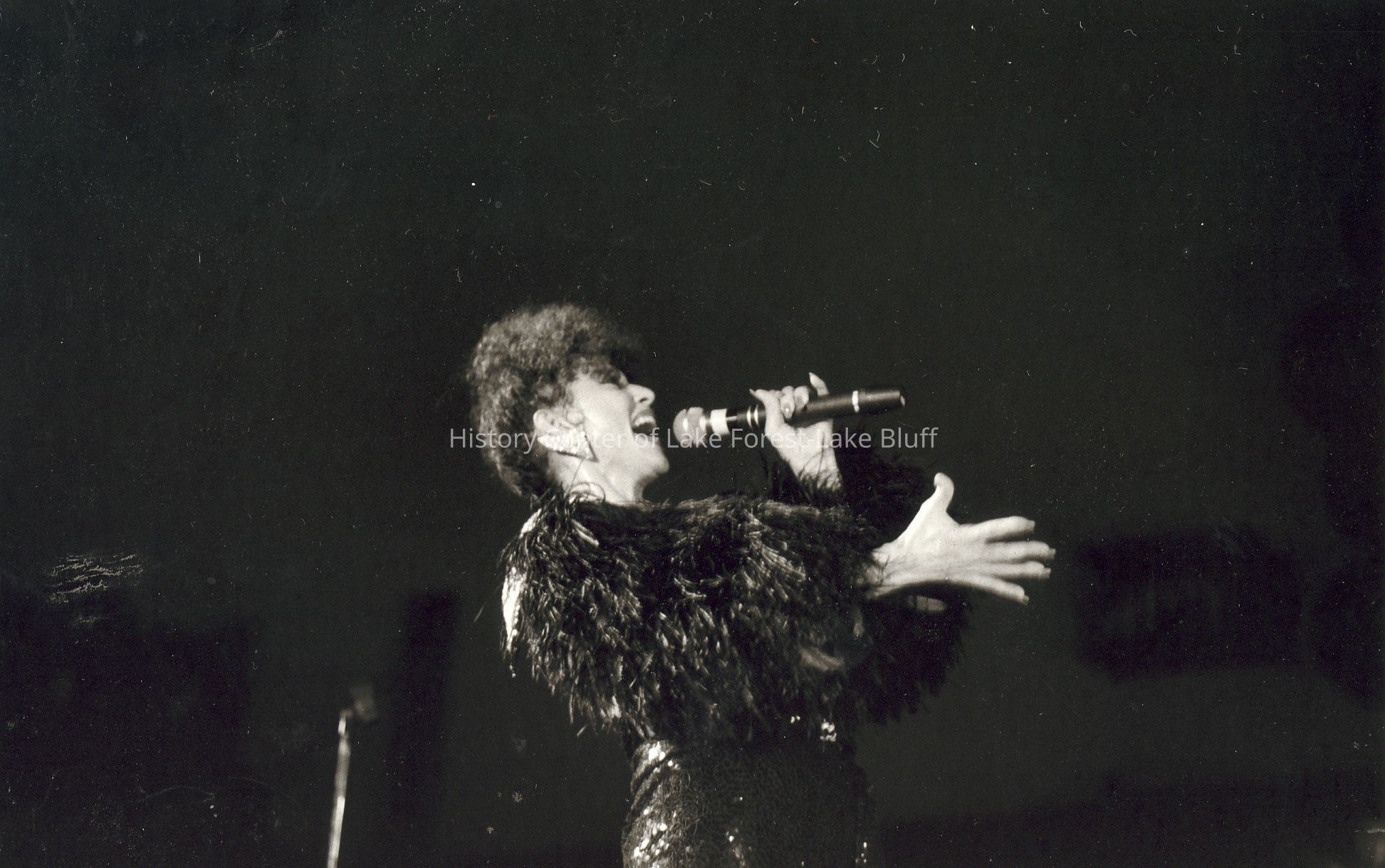 A performer passionately sings into a microphone, wearing a fur-trimmed outfit, against a dark background
