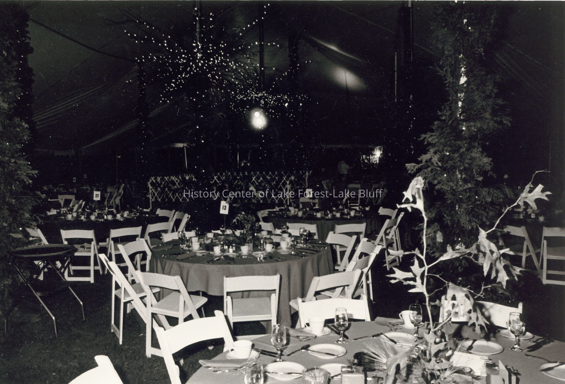 The image shows a dimly lit, elegant event setup under a tent, featuring round tables with neatly