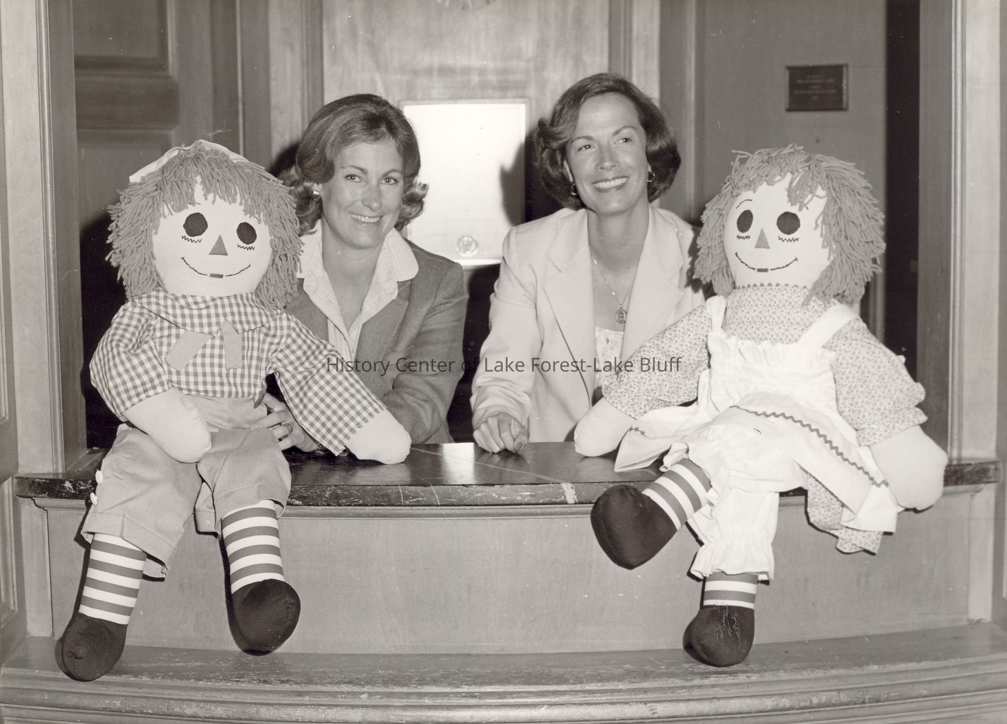 Two women, smiling, pose next to large Raggedy Ann and Andy dolls on a wooden counter.