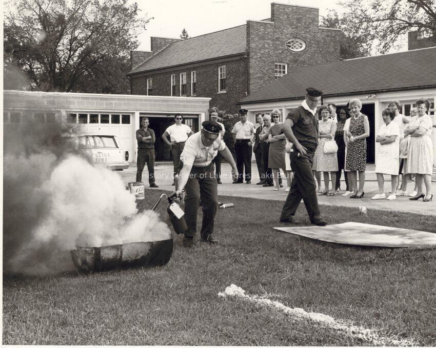 Fire Safety Training. Fireman demonstrating use of fire extinguisher in front of many others outside.