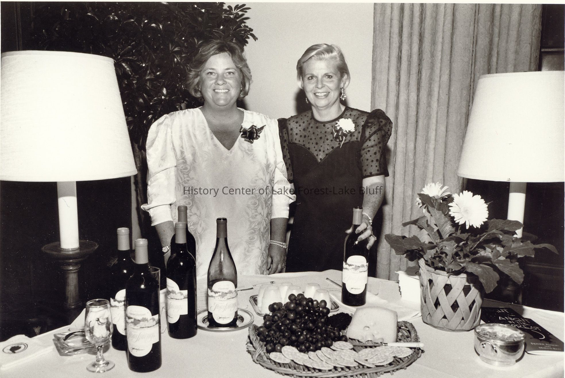 Two women smiling stand behind a table with wine, cheese, and flowers.