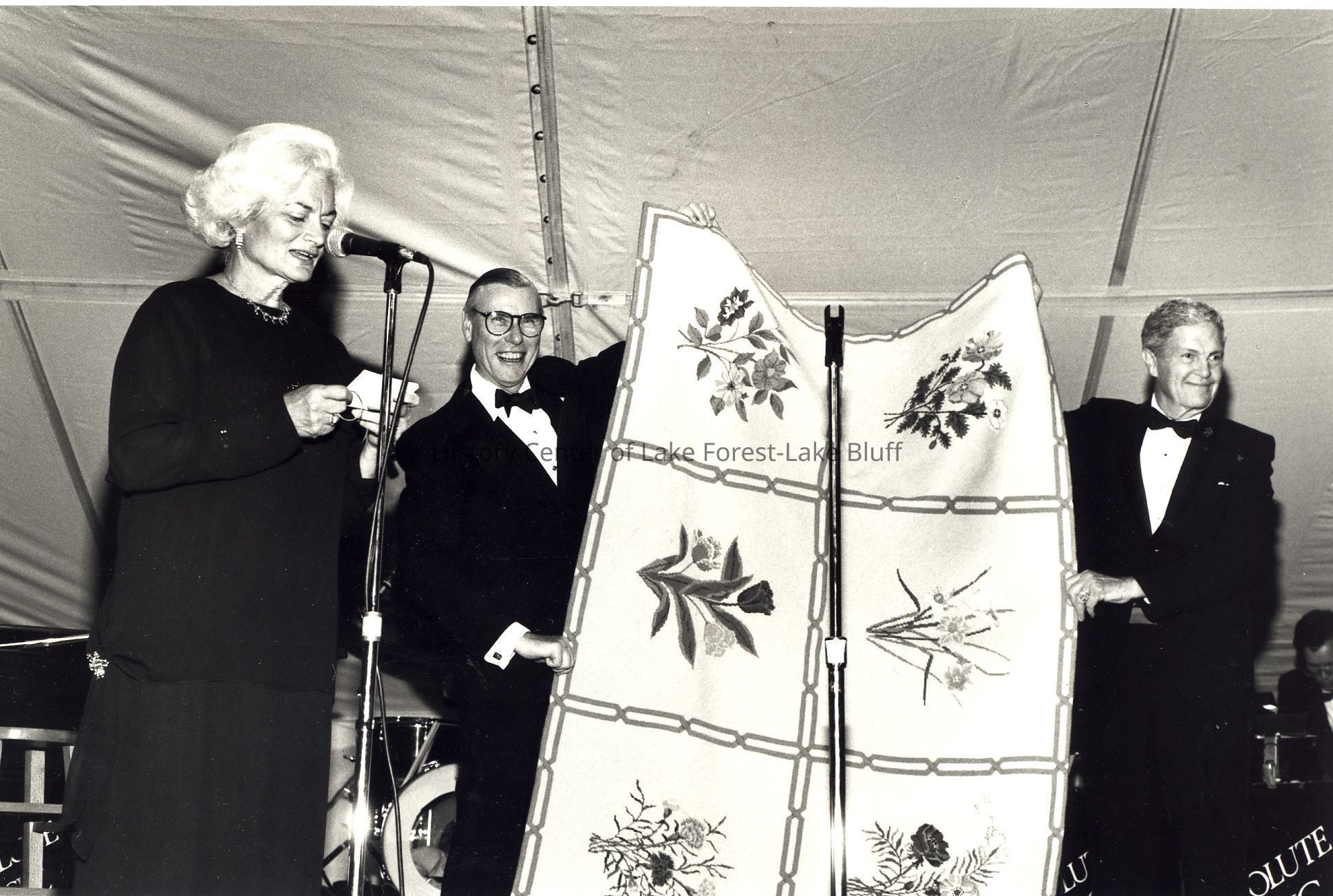 Ida Stanley, Bill Crane and ? with rug needlepointed by members of the Women's Board
