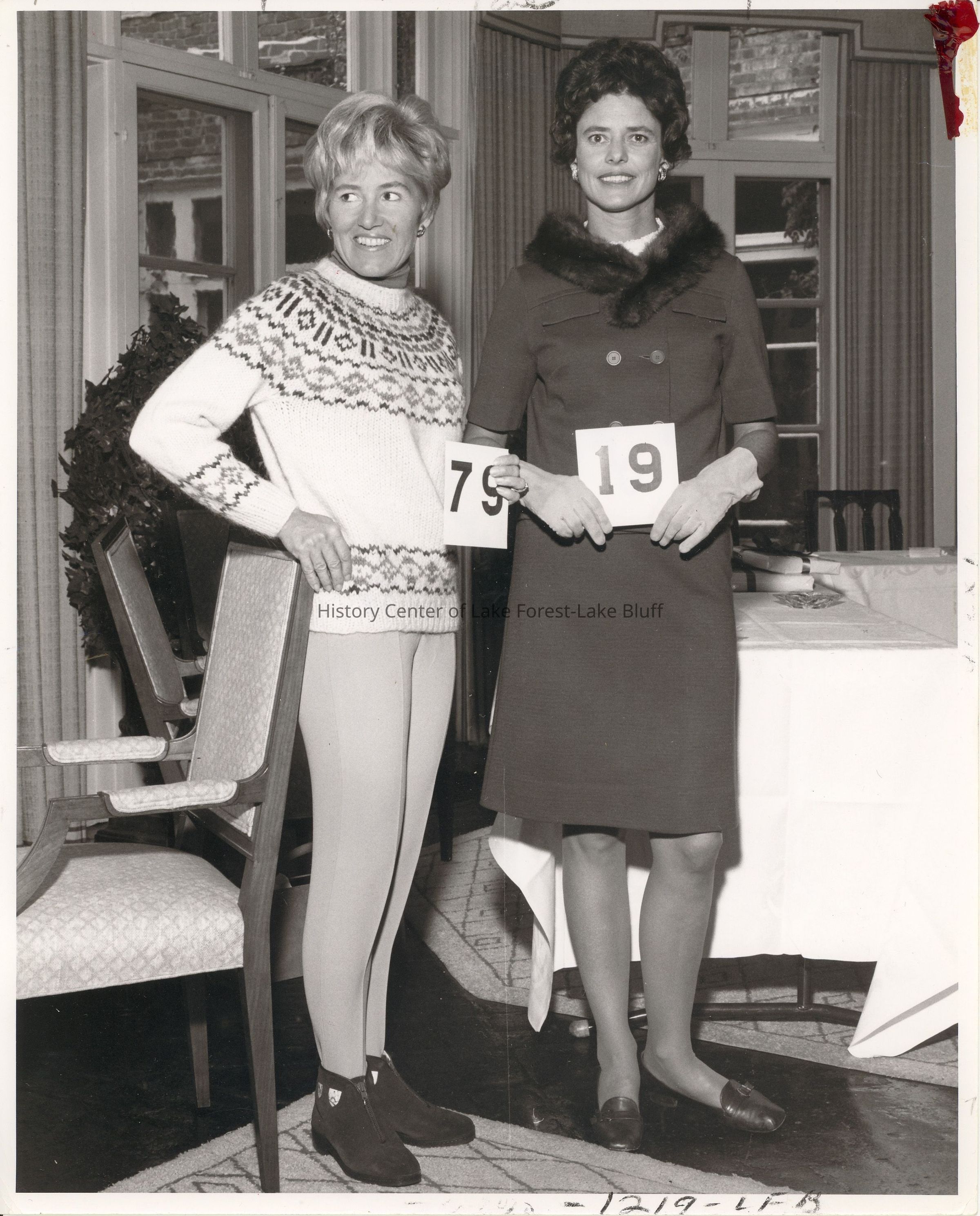 Two women are holding numbered cards, 79 and 19, and standing together smiling indoors.