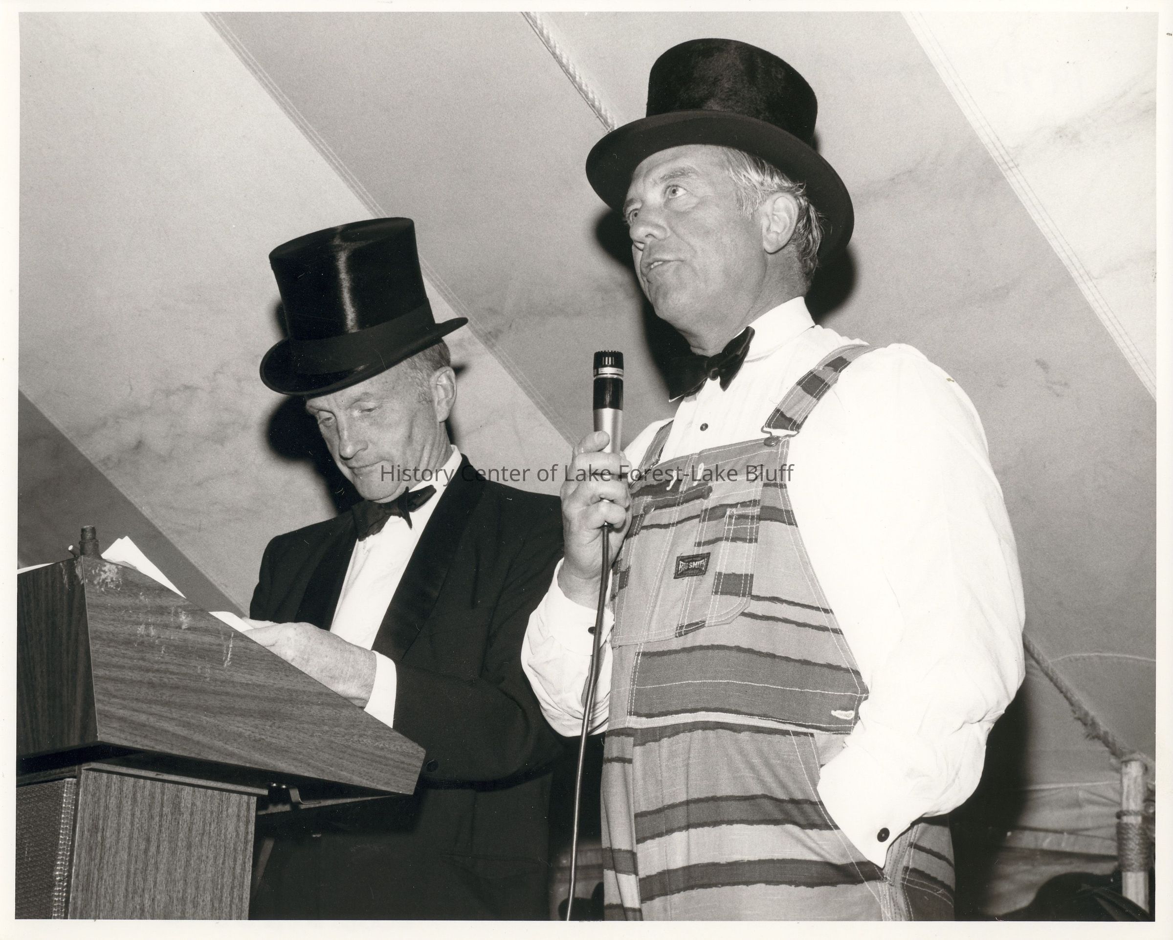 Two men in top hats stand together, one speaking into a microphone while the other reads.