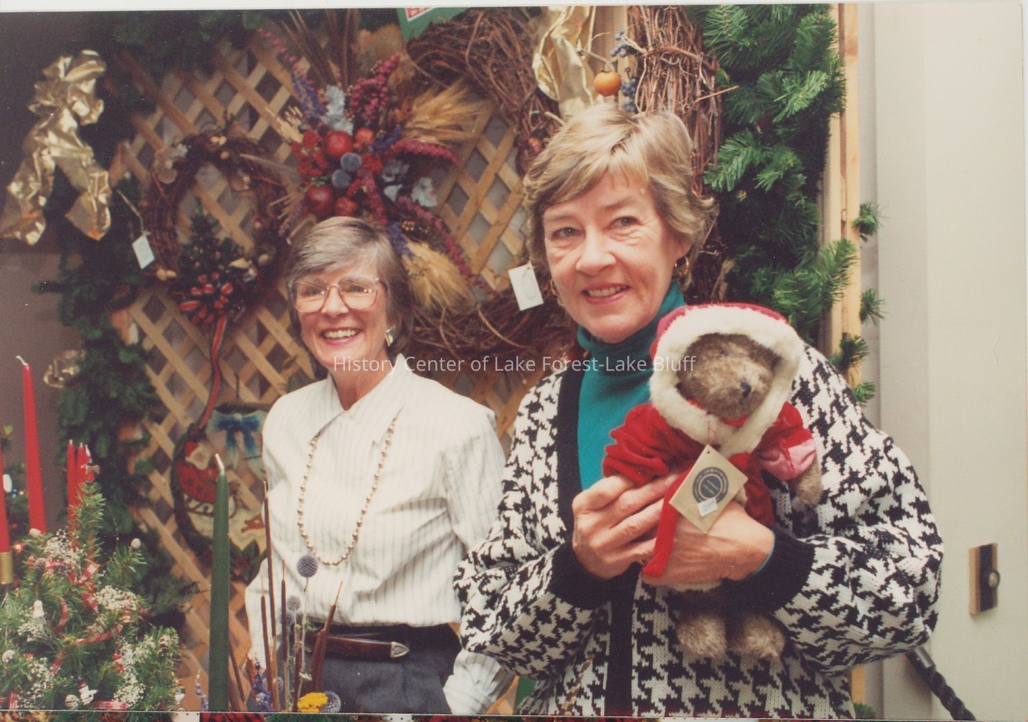 Two women smile warmly in a festive setting, with one holding a cute stuffed animal.