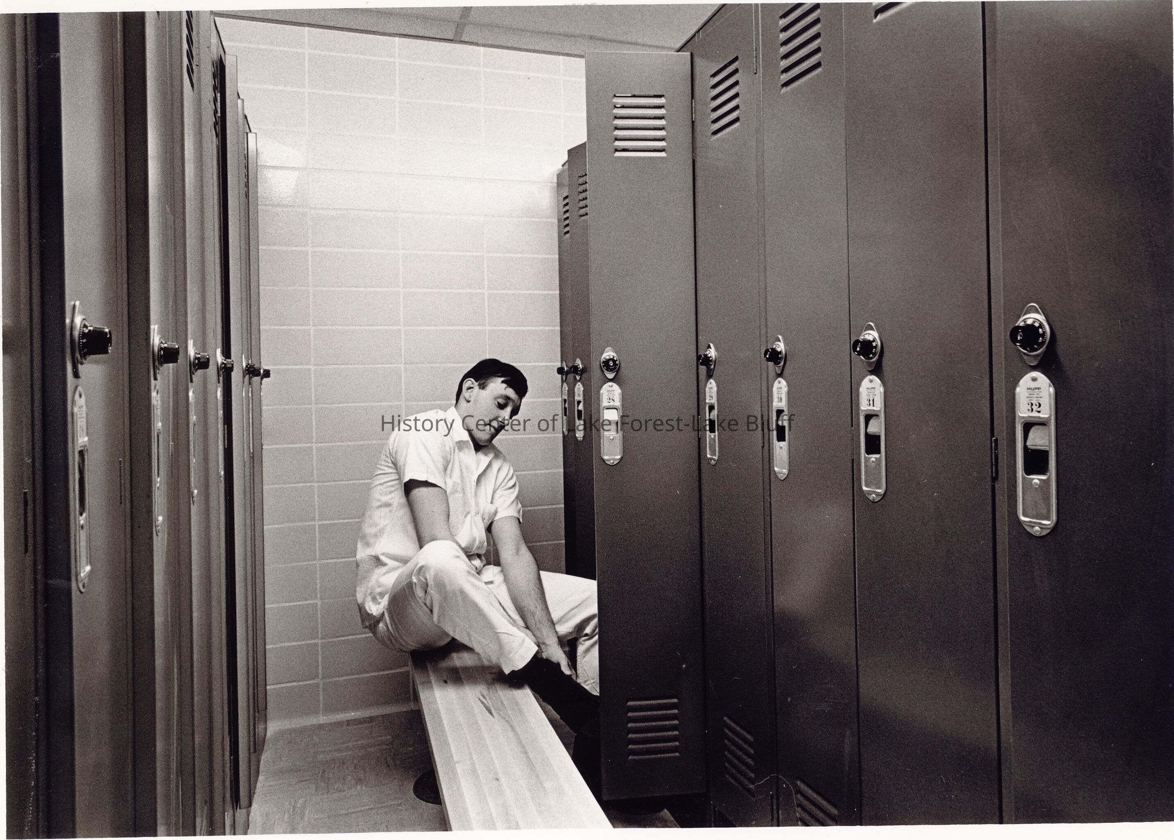 Young man in locker room removing socks. Same as an earlier photo.