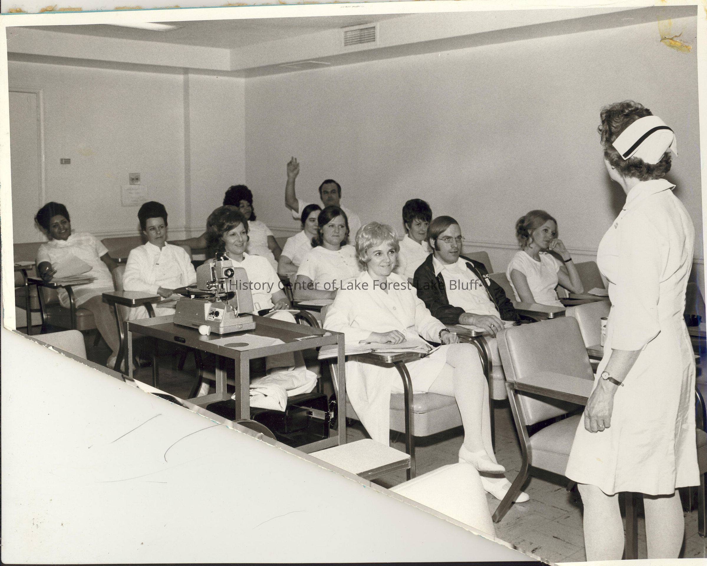 Nurse in a classroom speaking to 9 female and 2 male clinicians. One of the males has hand raised presumably to ask a question.