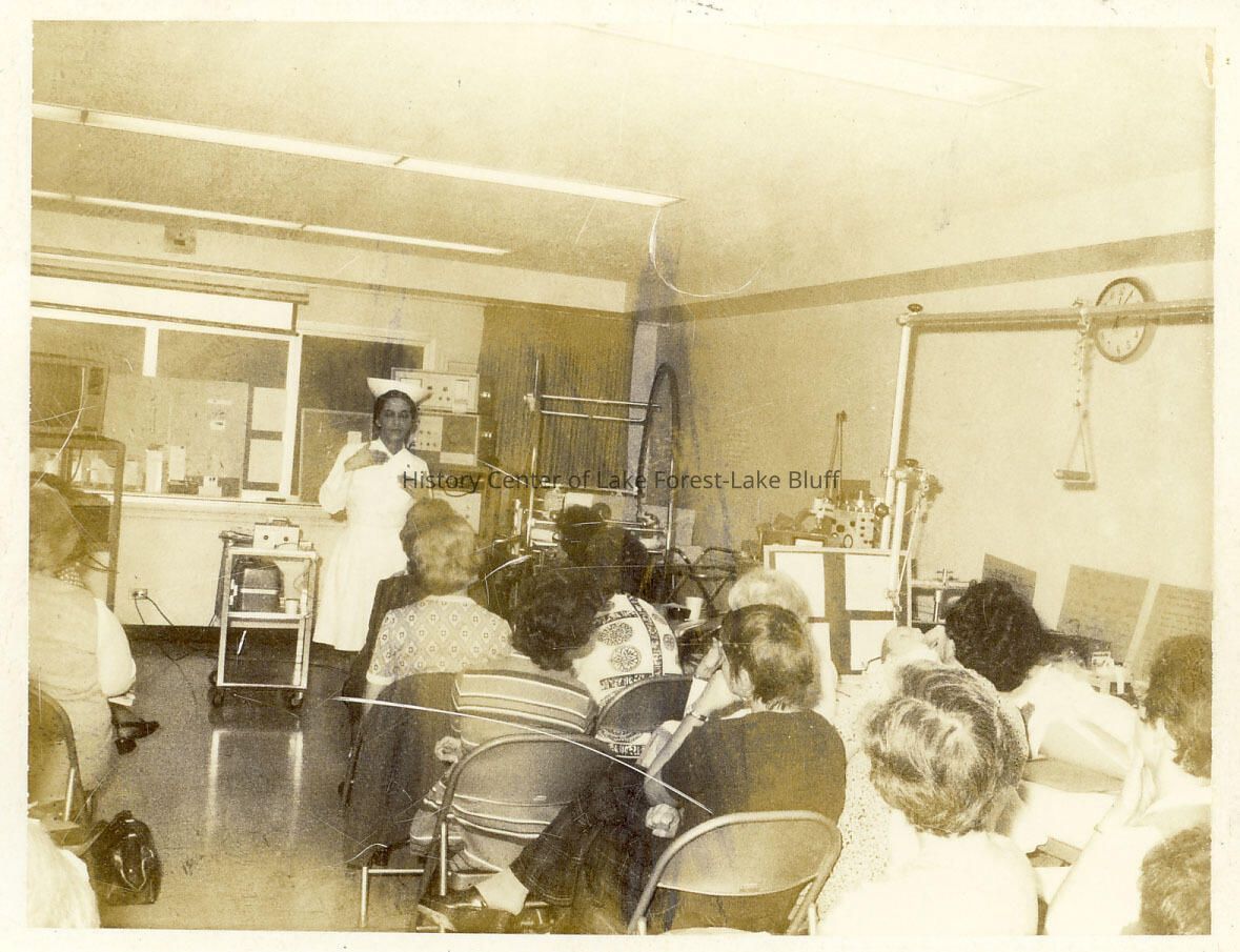 Nurse addressing classroom of women. Blood Typing and Donation.