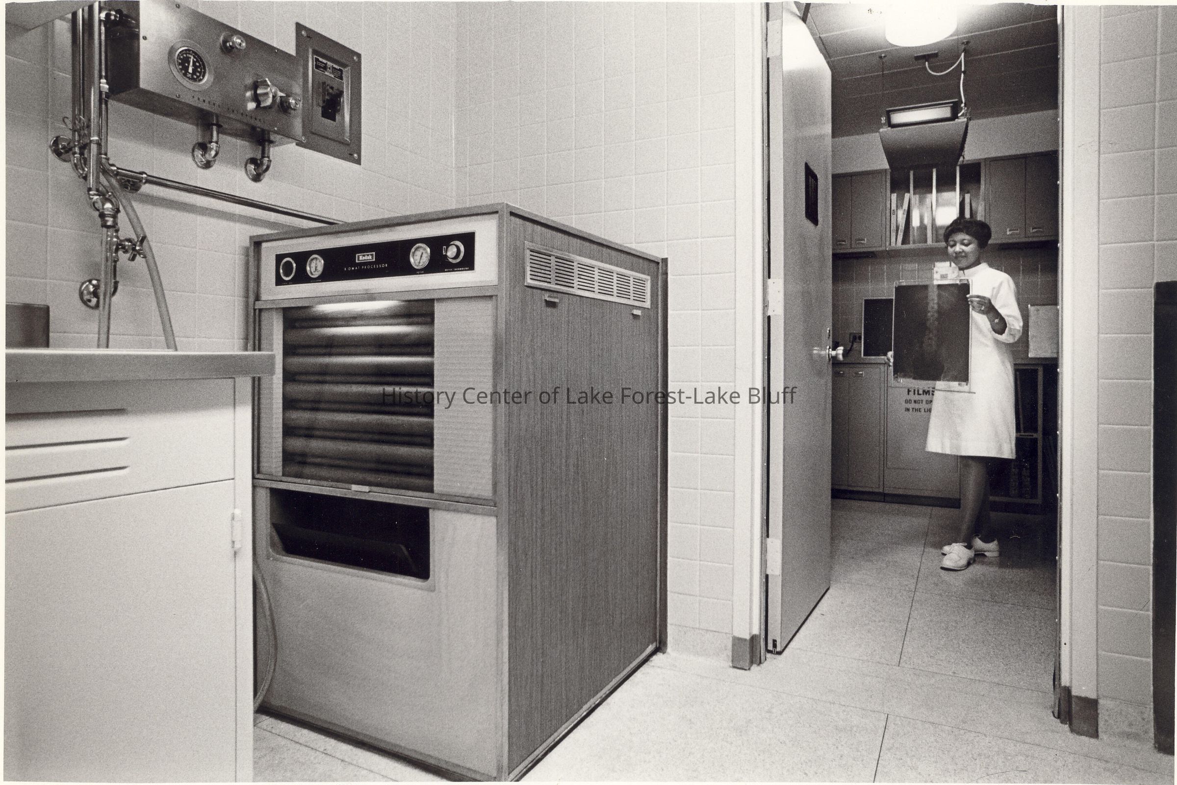 Female clinician holding x-ray with Kodak machine in the foreground.