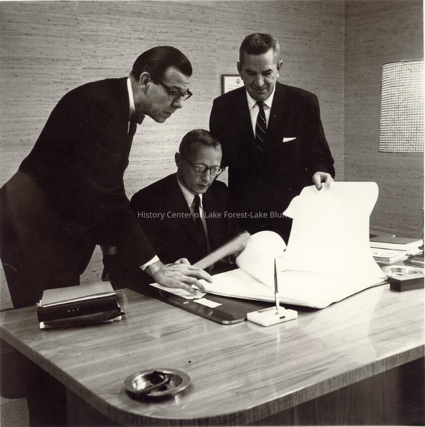 Bill Bergman, George Caldwell and Dr. Looby reviewing a document.