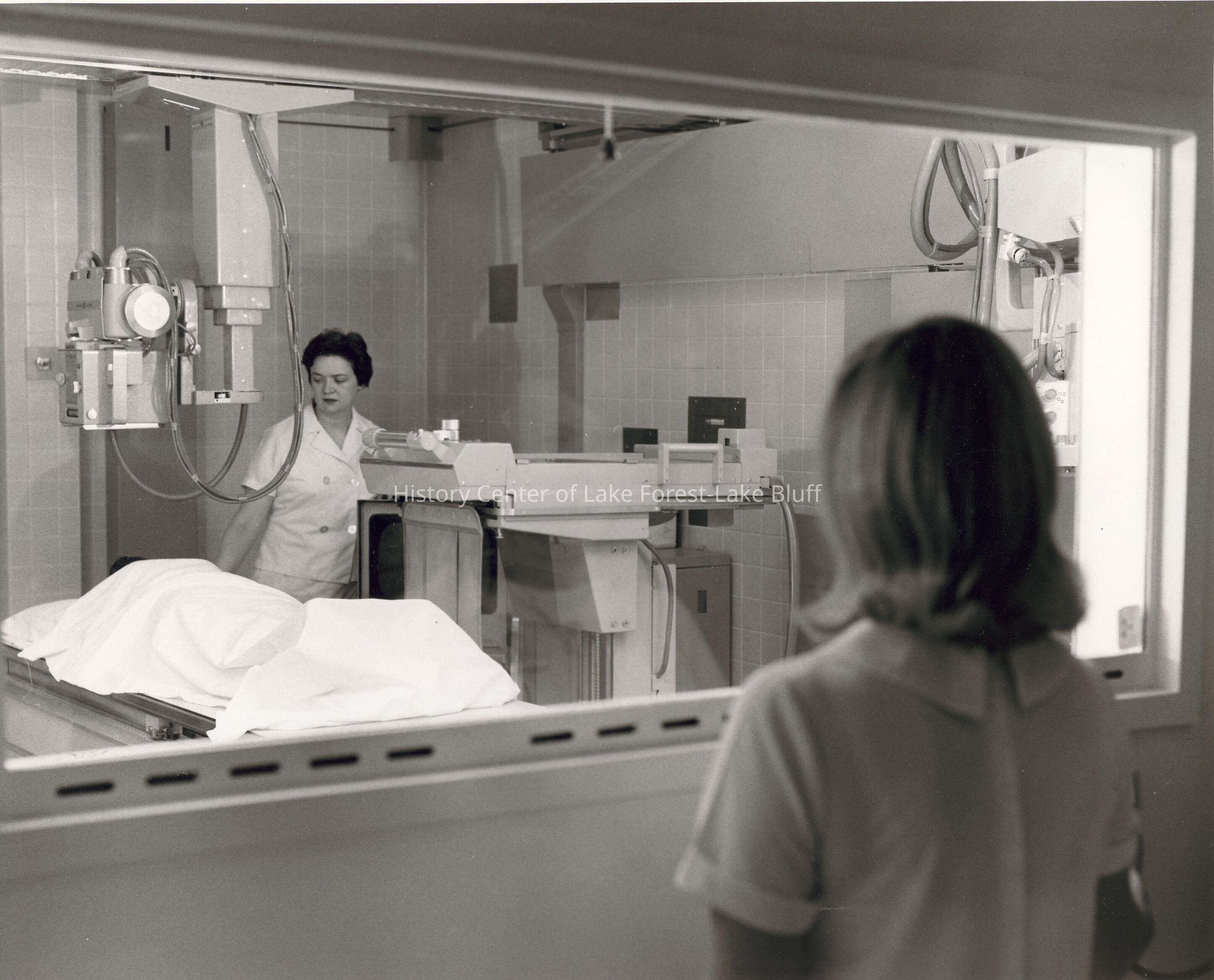 One female technician in room with patient and what looks like an x-ray machine observed by one technician through a window.