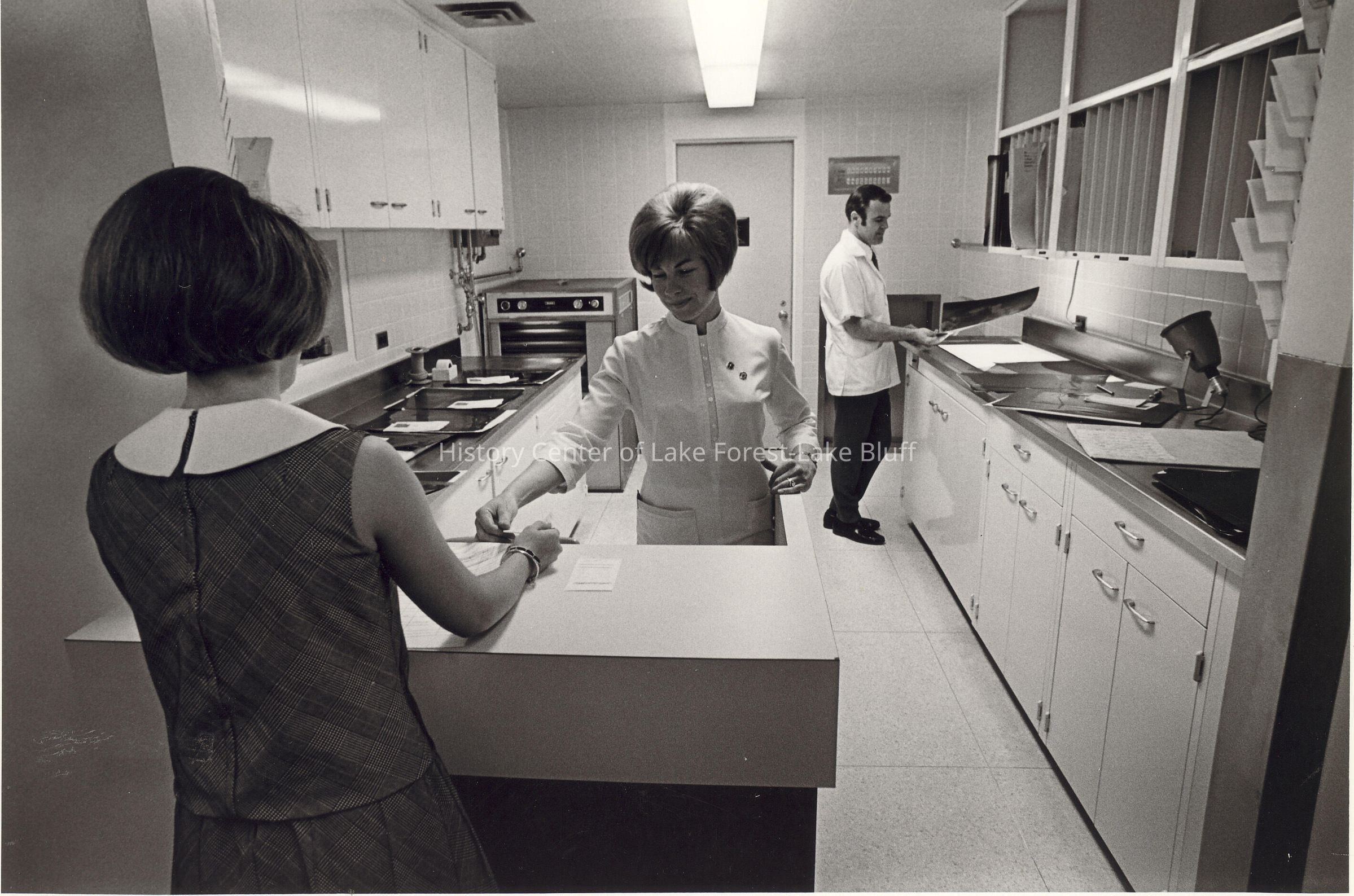 Looks like Radiology with two females in foreground and male in background.