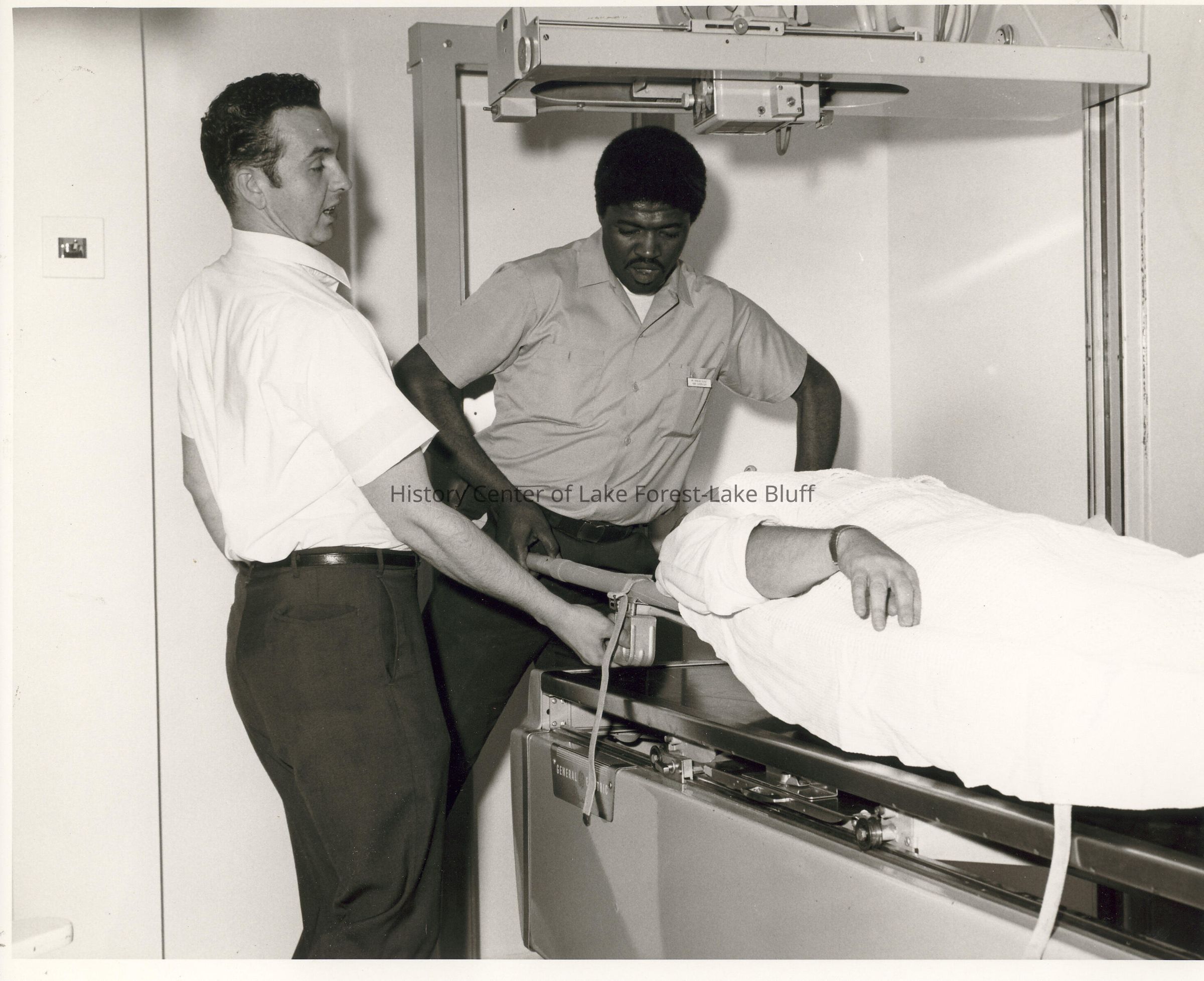 Two men with a patient on what looks like x-ray table. Folder is titled Disaster Drill.