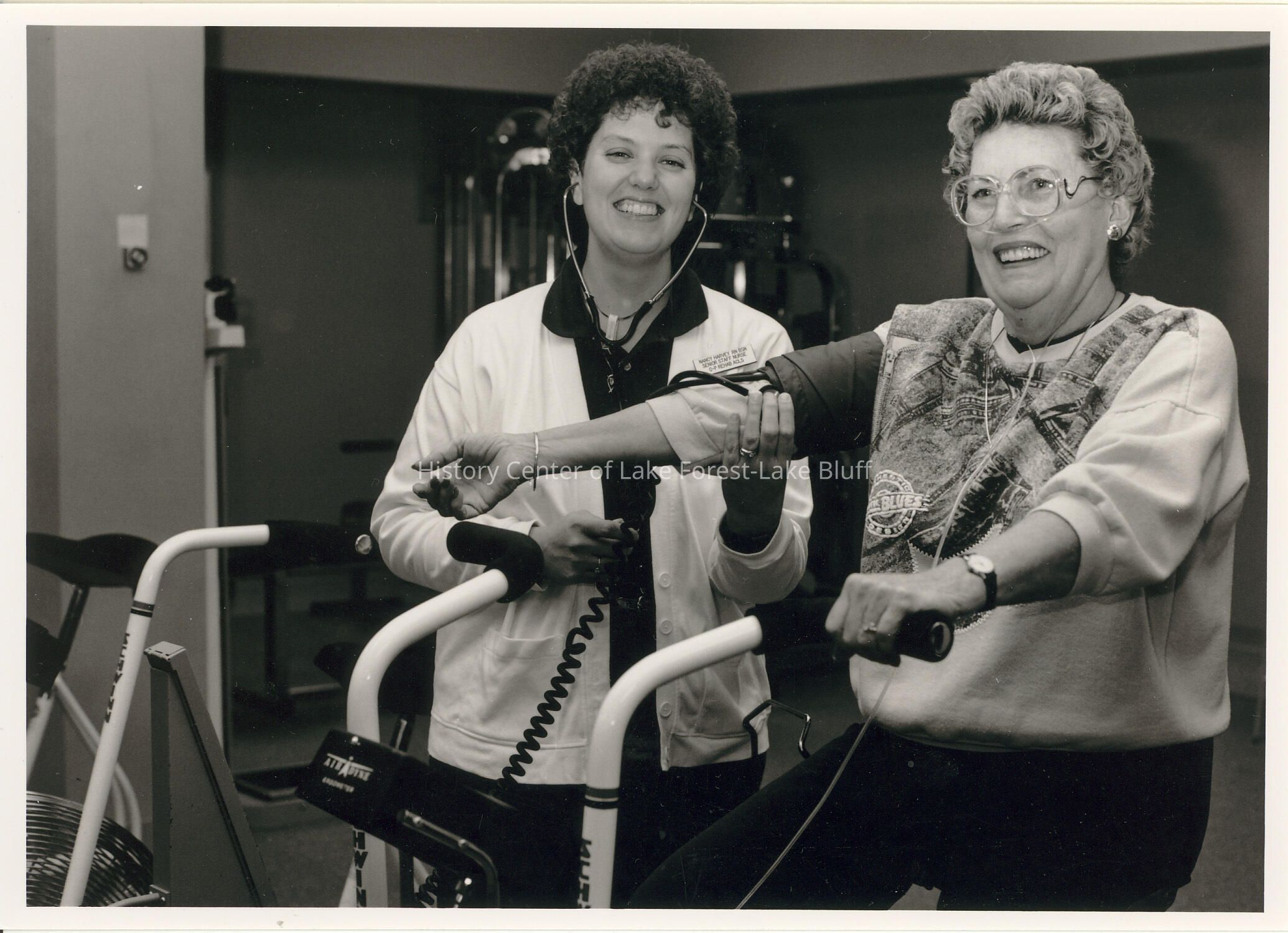 Female Clinician, wearing nametag, taking the blood pressure of a woman on a stationary bike.