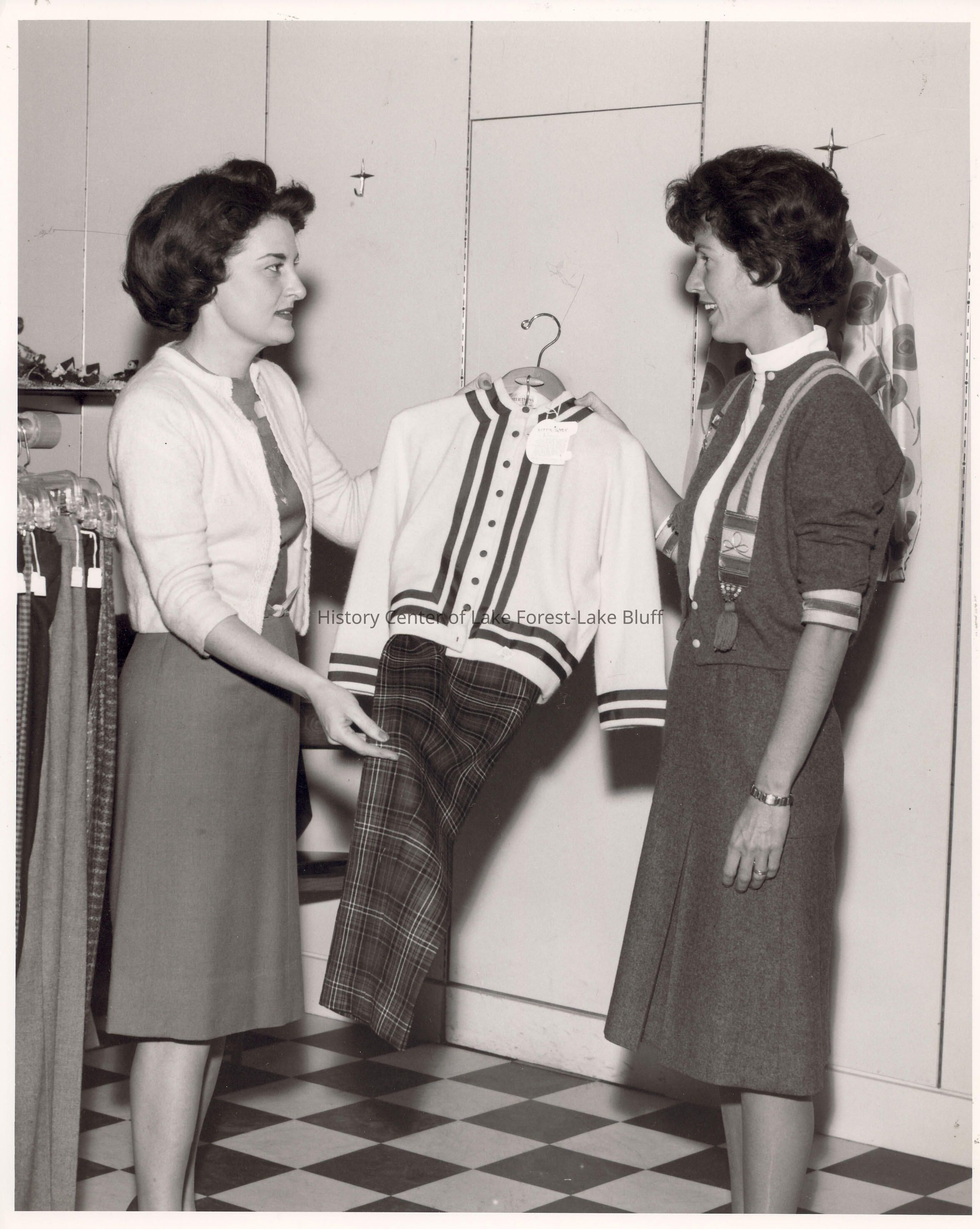 Women's Auxiliary: Two women holding suit, presumably at rummage shop.