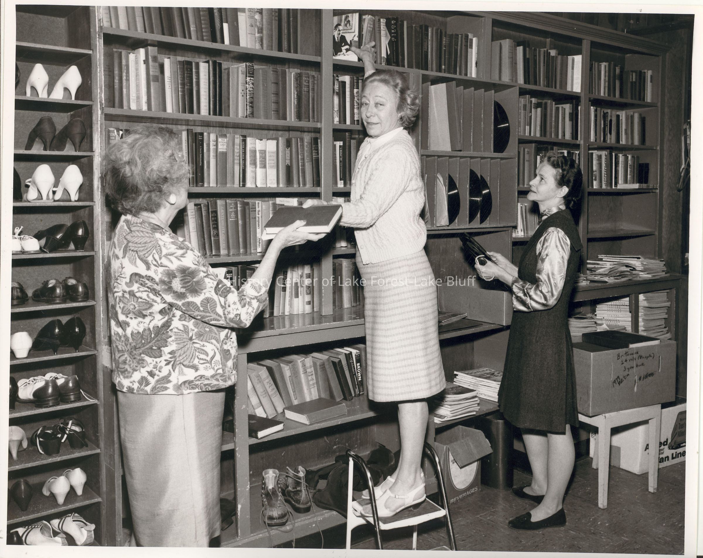Women's Auxiliary: Three women in front of bookshelves, presumably at rummage shop.