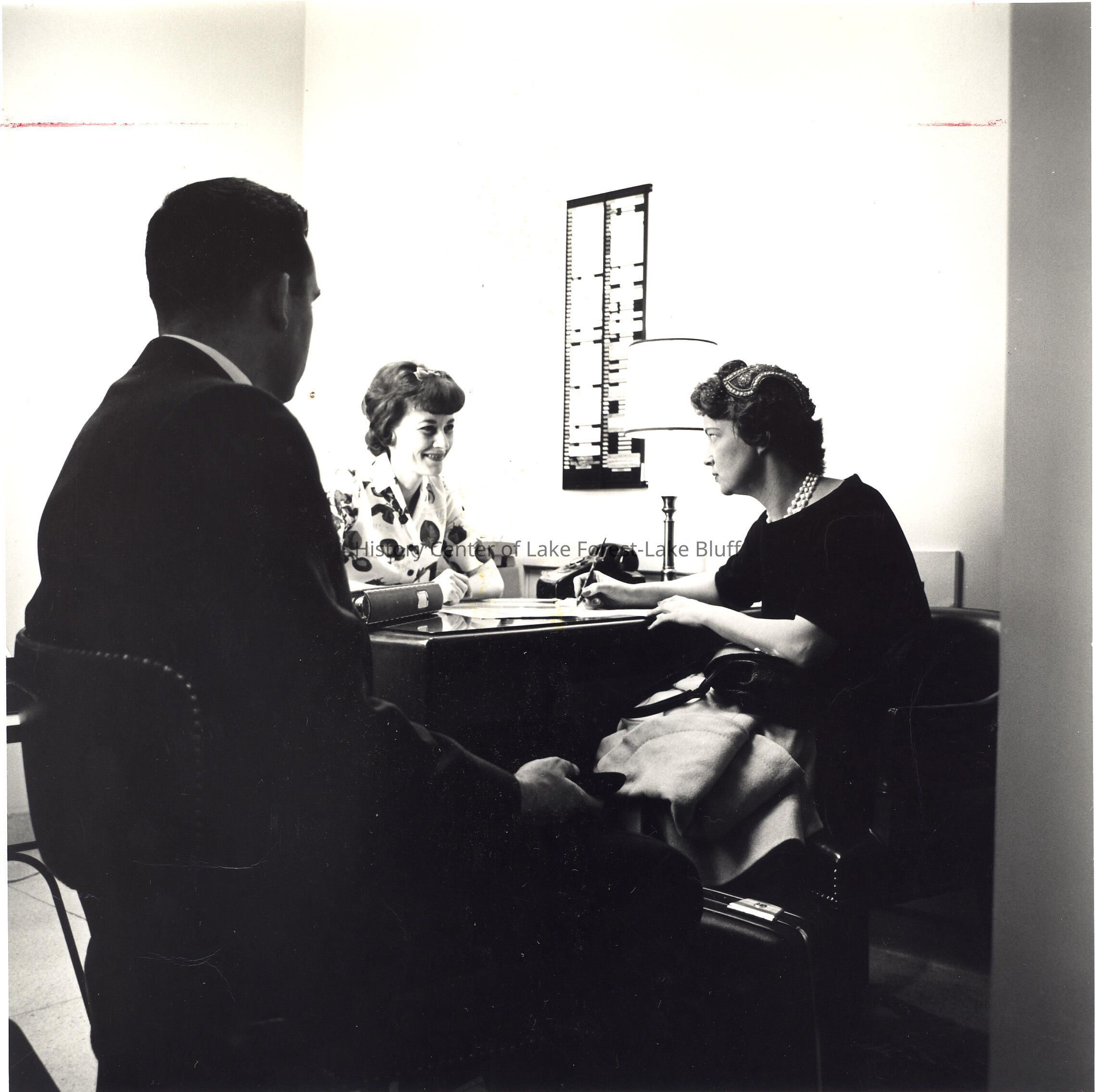 Man and a woman speaking to another woman behind a desk.