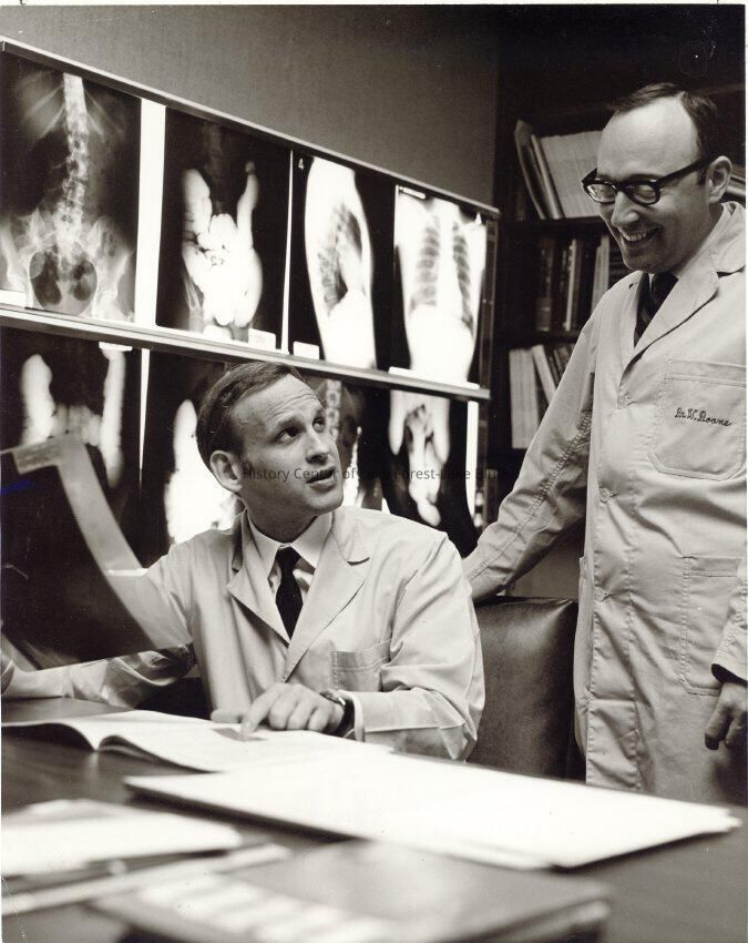 Two doctors looking at x-rays. One is Dr. Doane.