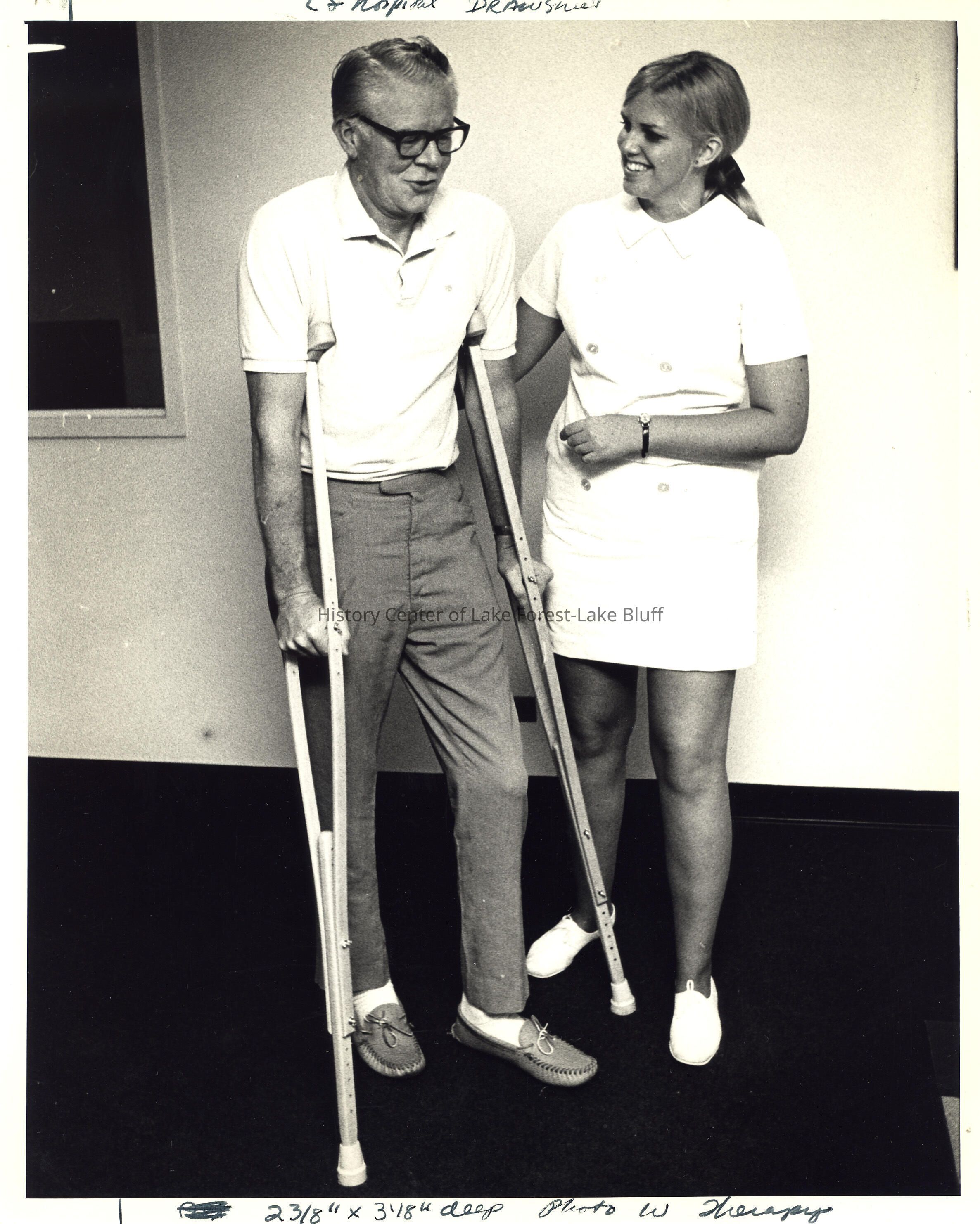 Man with crutches being helped.
