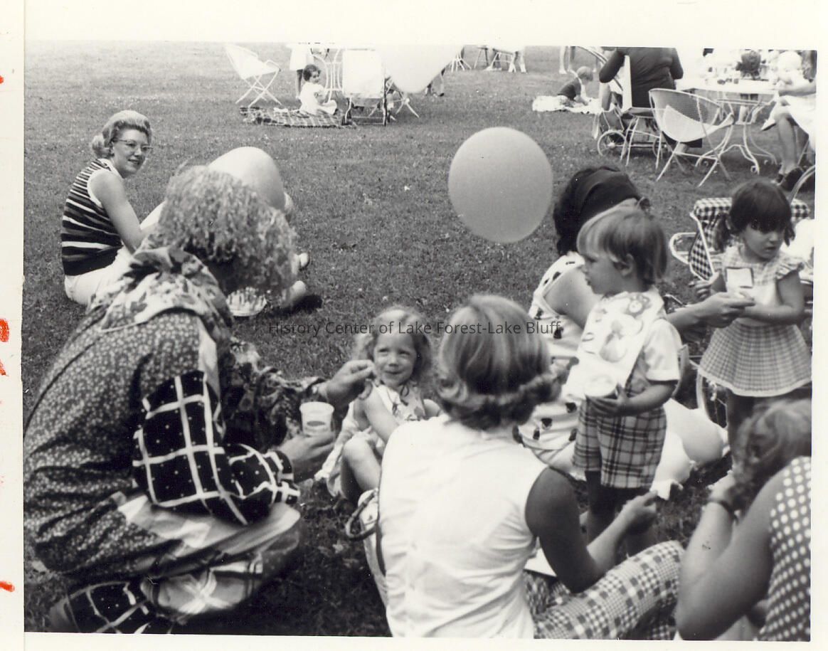 Lawn setting with clown entertaining small group of children and adults. Baby Alumnae party presumably.