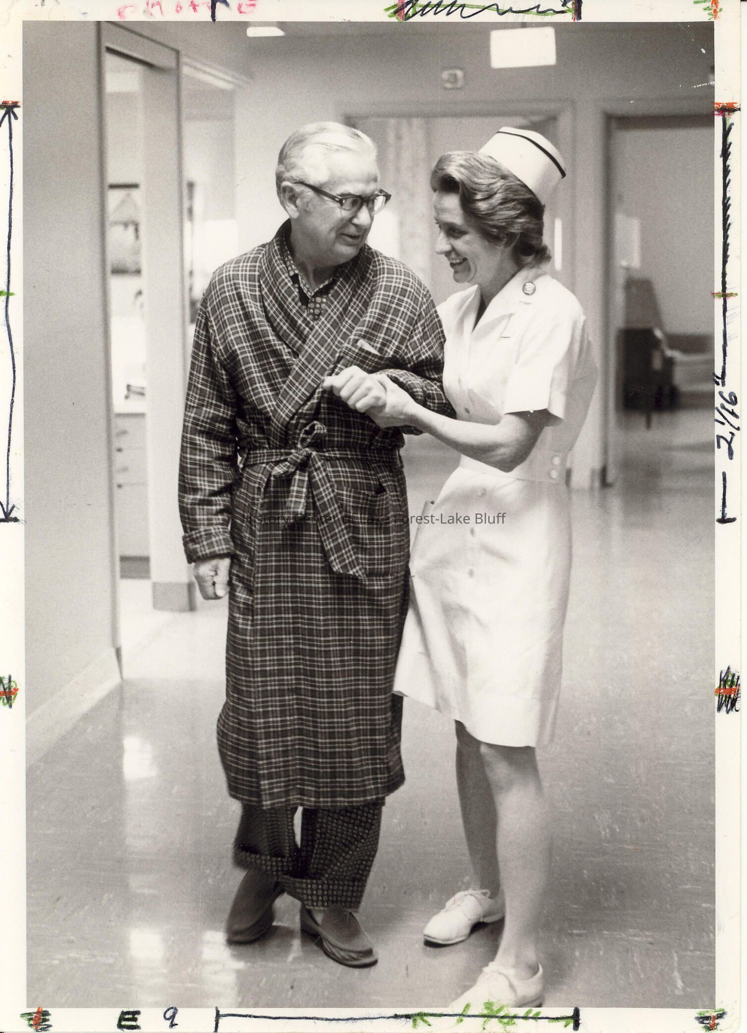 Female nurse helping older male patient in bathrobe walk. Photo says Coralie Carden and Ida's photo.