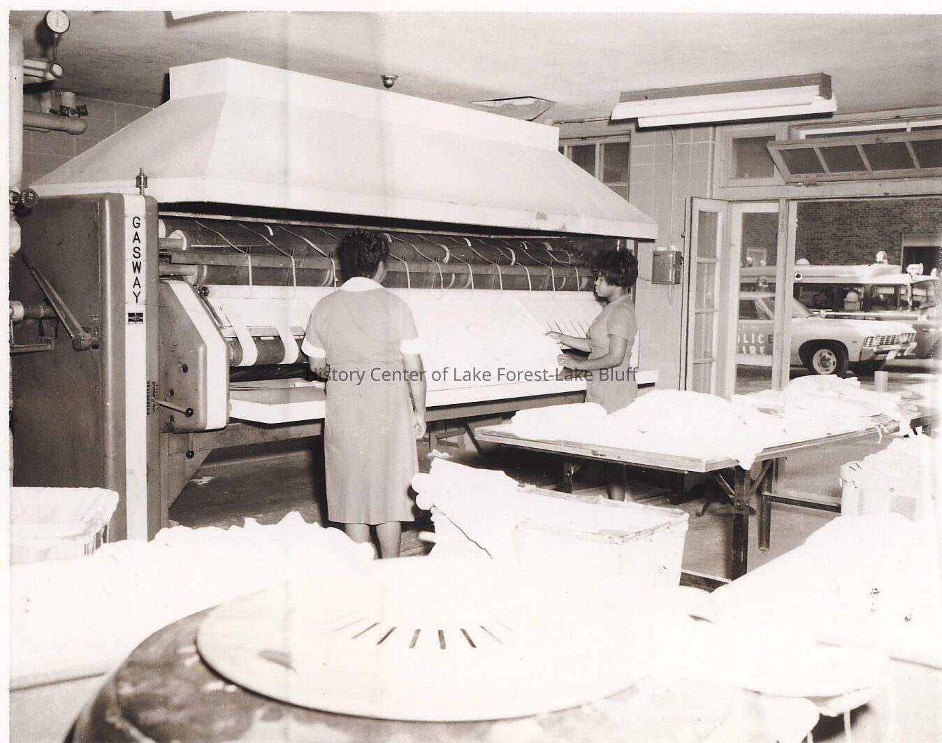 Two women working in hospital laundry room.
