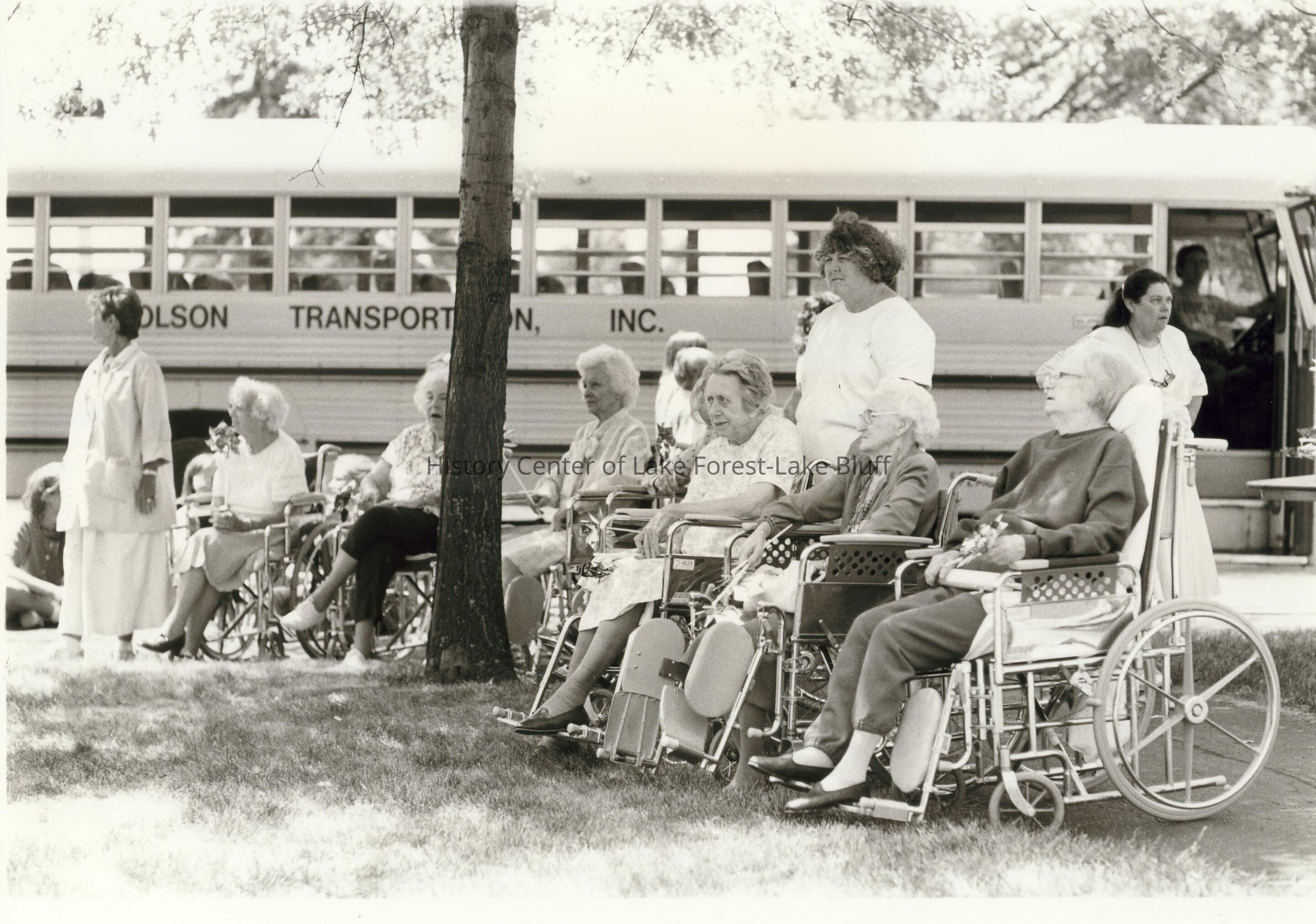 Senior citizens seated outside in wheelchairs.
