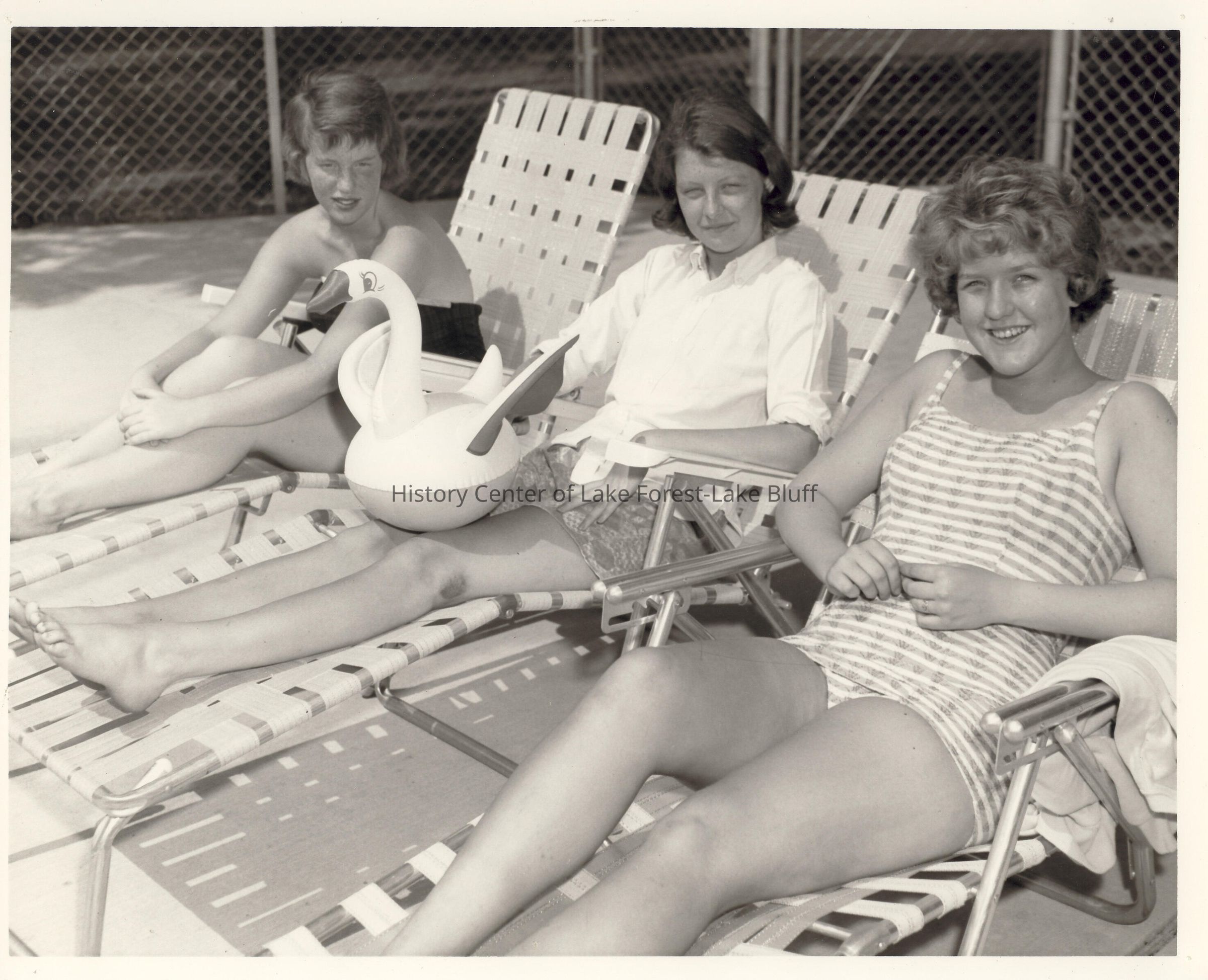 Three young ladies, presumably Candy Stripers sitting on lounge chairs at what appears to be a pool.