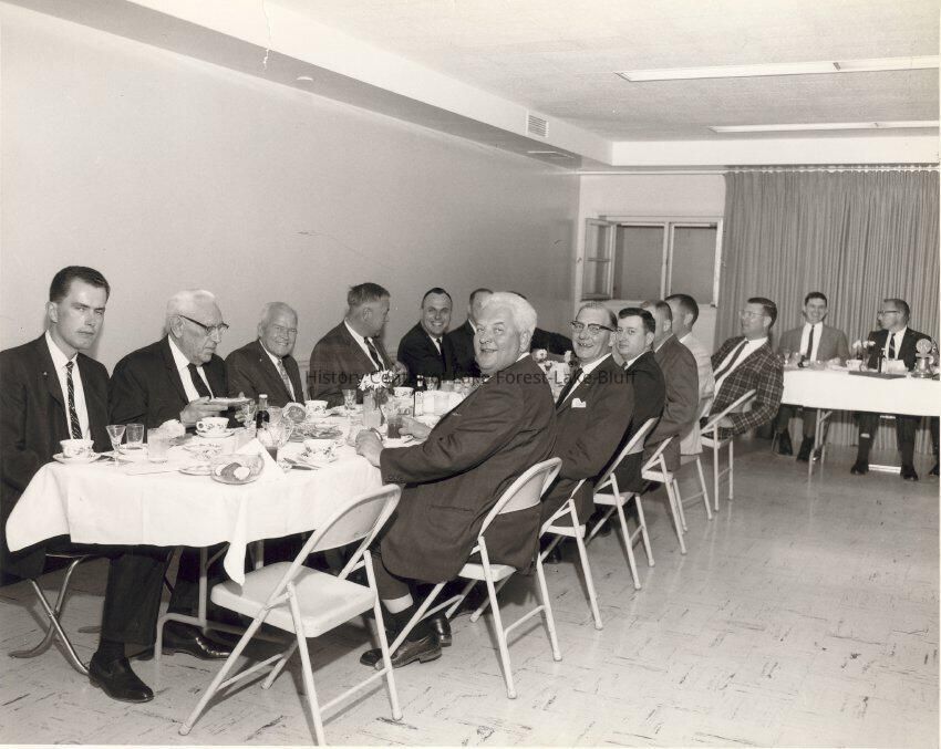Unidentified men in suits at meal table.