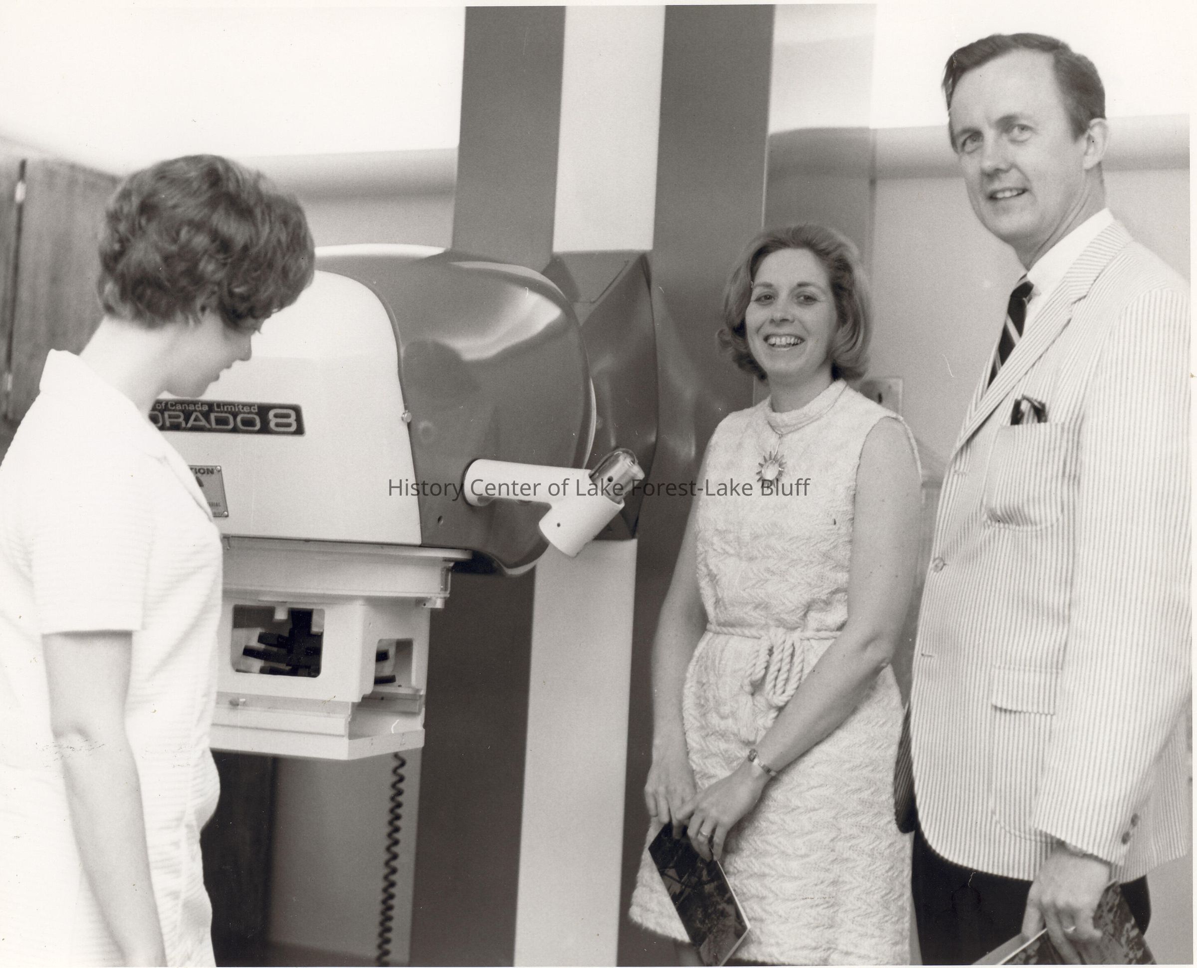 Two females and male in seersucker jacket with what looks like X-ray machine.