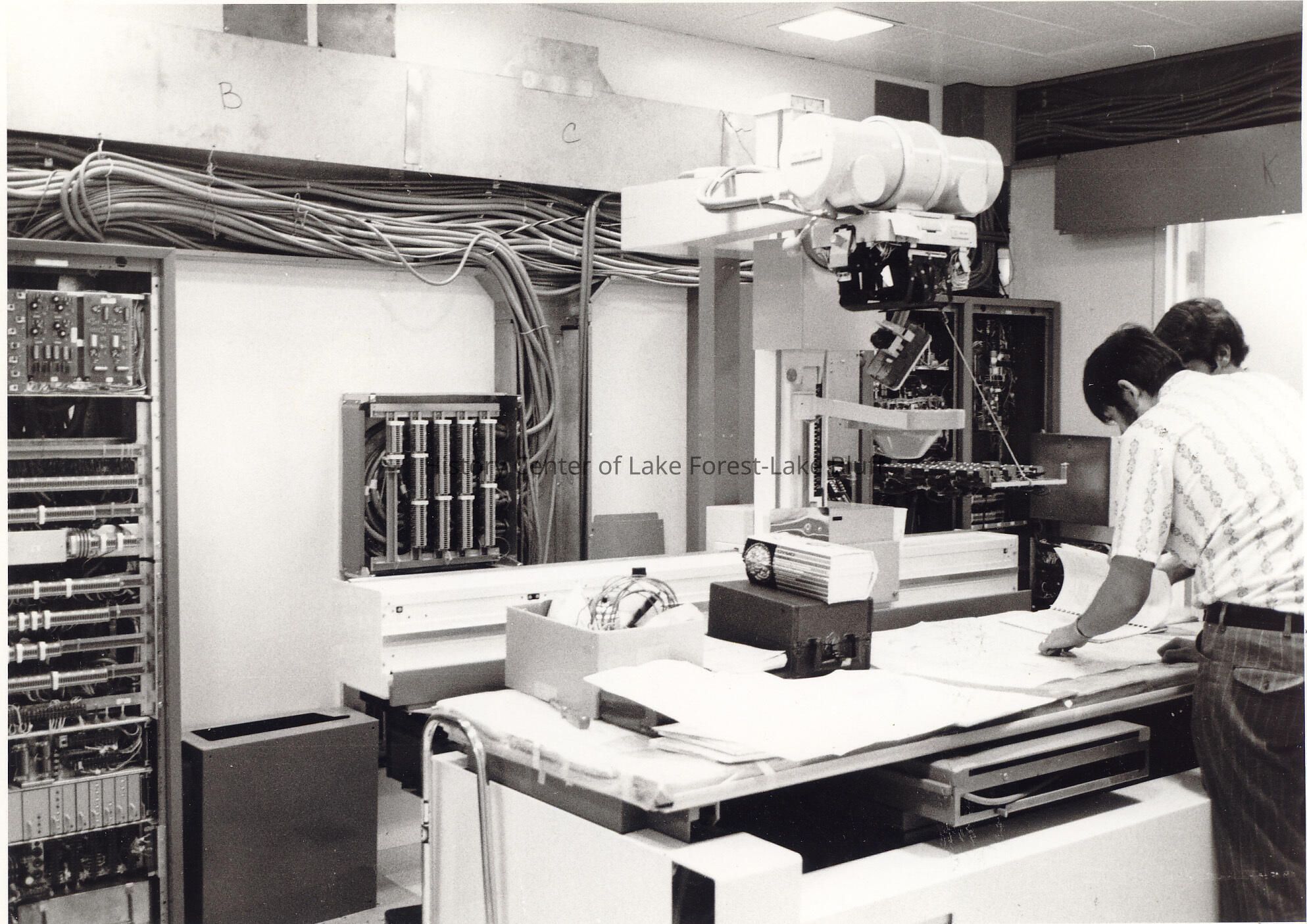 Two males reviewing documents on x-ray machine table.